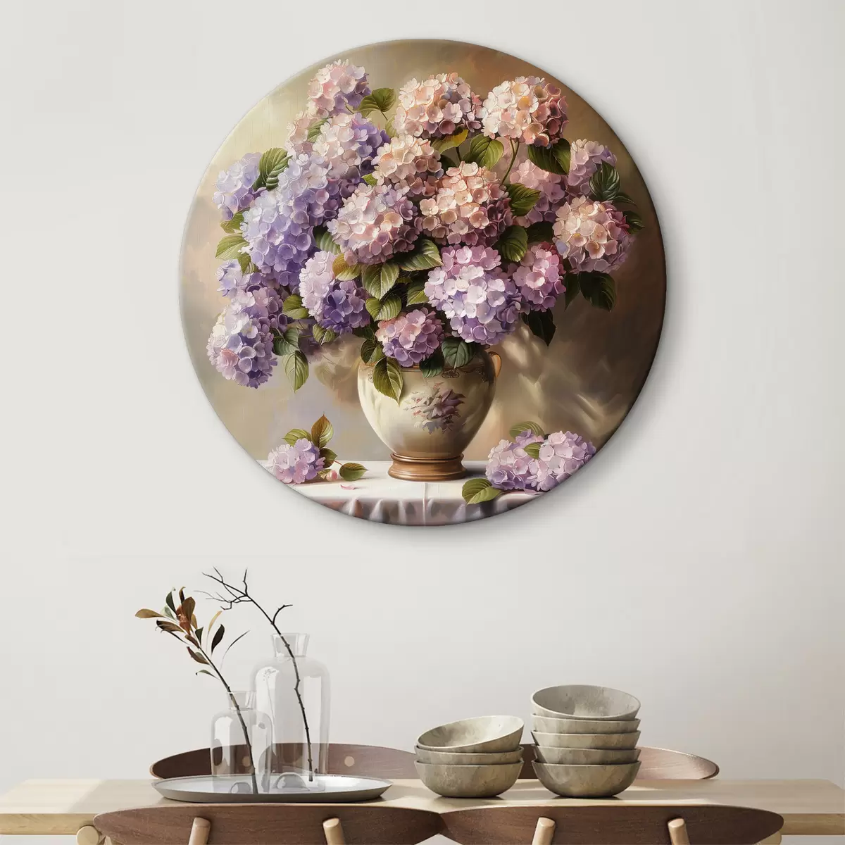 Okrągły obraz Delikatne hortensje na stole Nr r38710