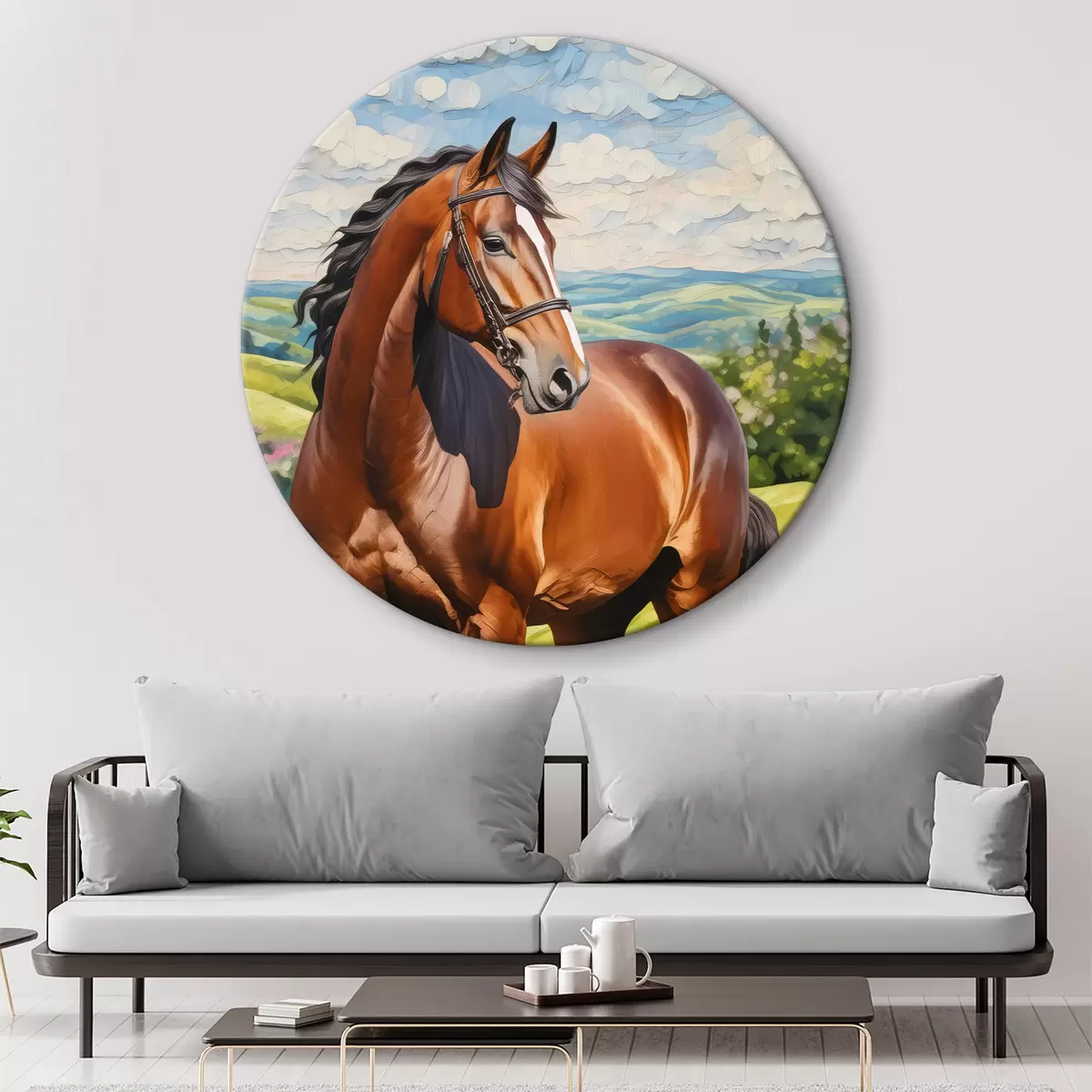 Okrągły obraz Piękny koń na trawniku, błękitne niebo Nr r38727