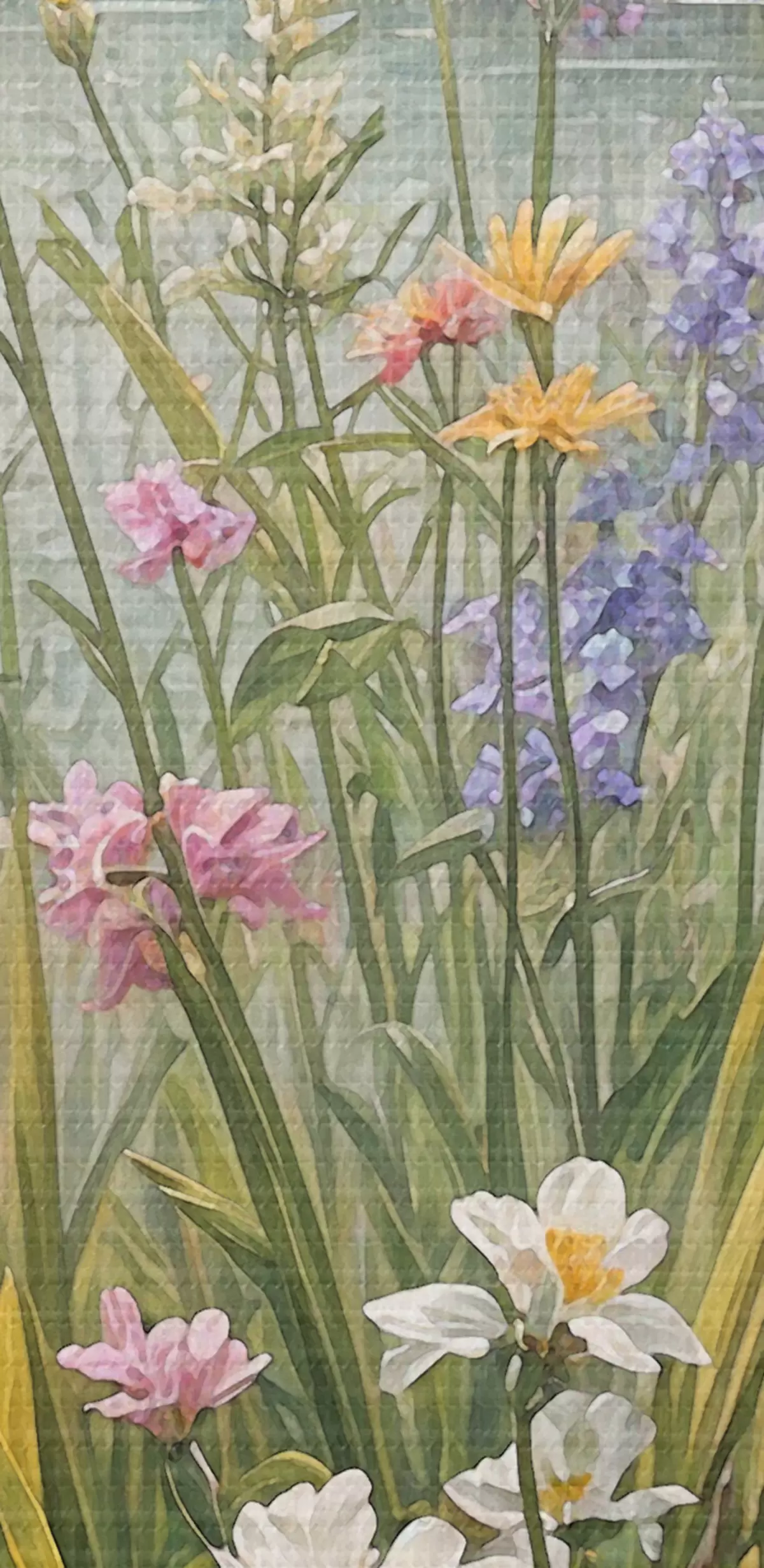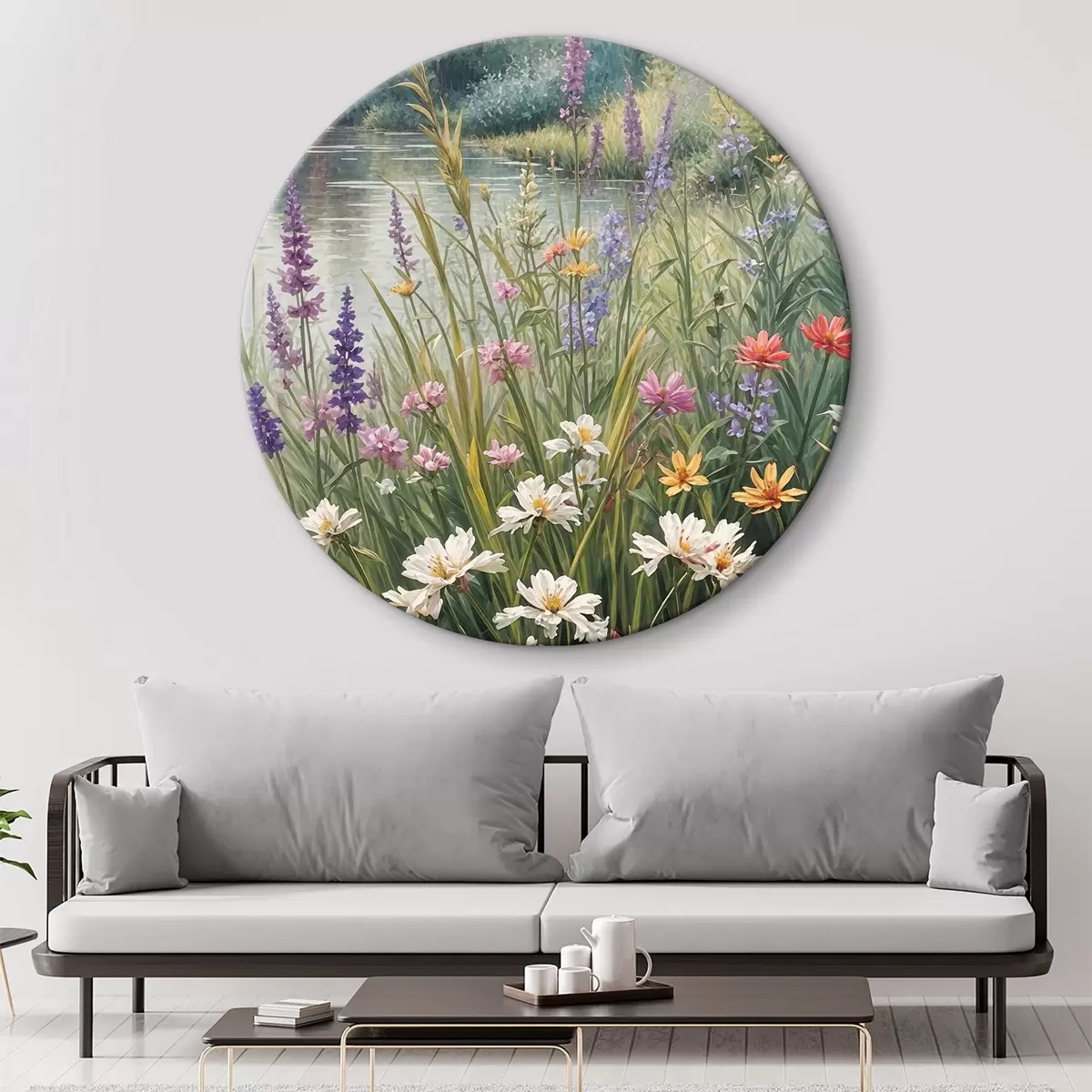 Okrągły obraz Polne kwiaty i wysokie trawy. Ogólna scena przedstawia żywy, naturalny krajobraz Nr r38829