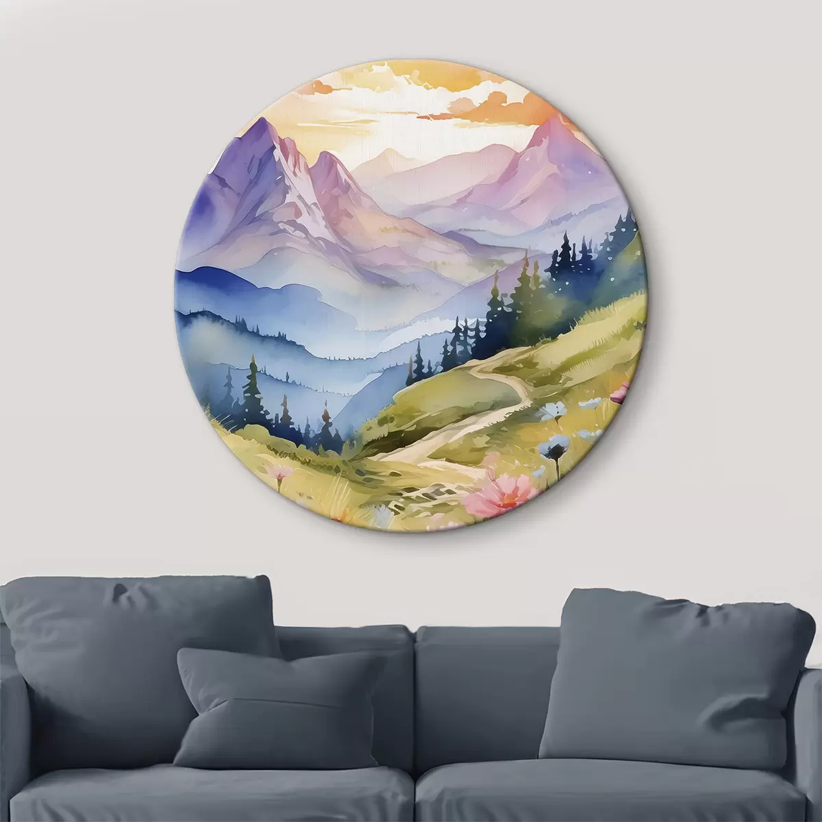 Okrągłe obrazy Krajobraz z kwiatami i górami r38839