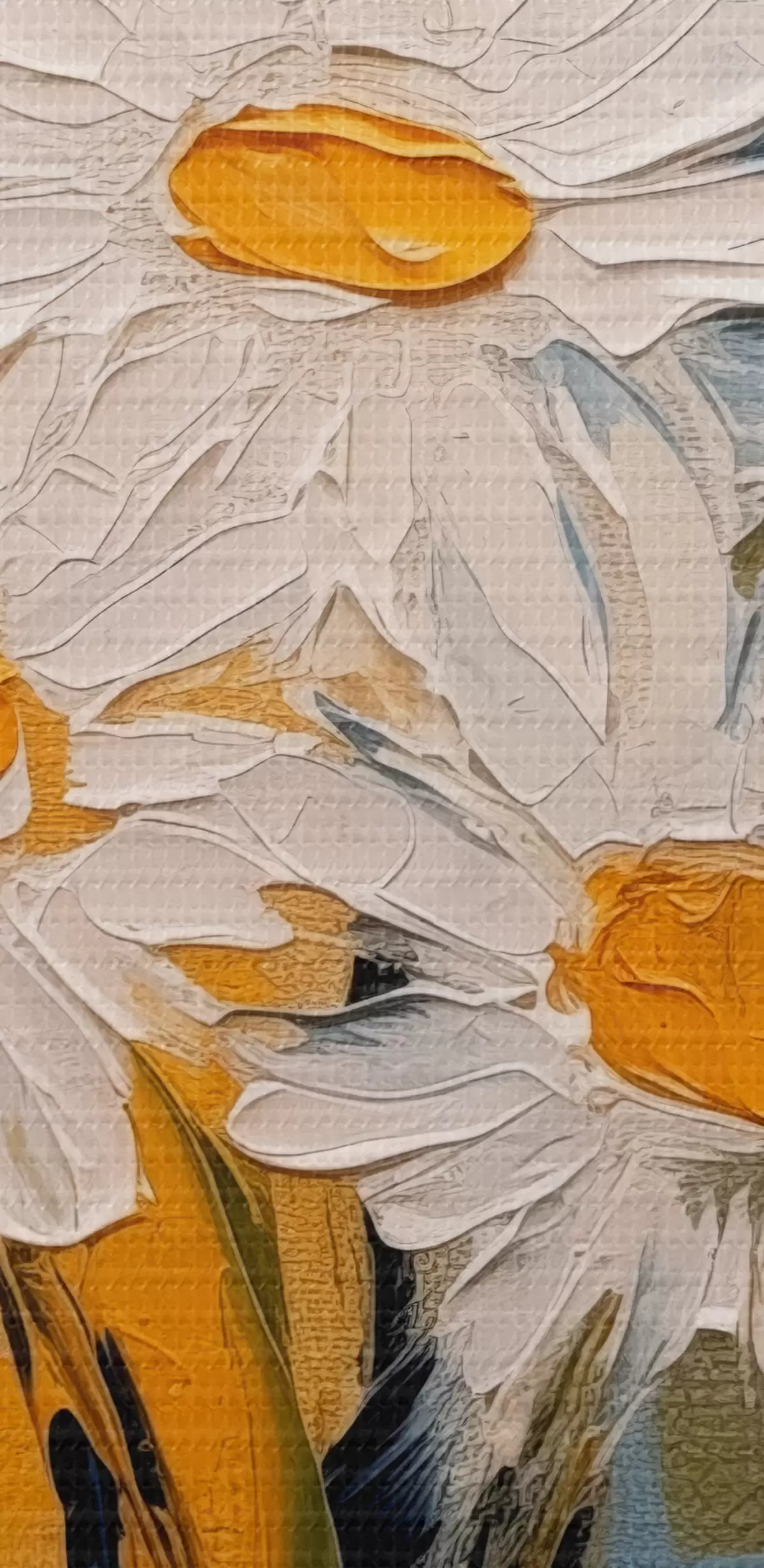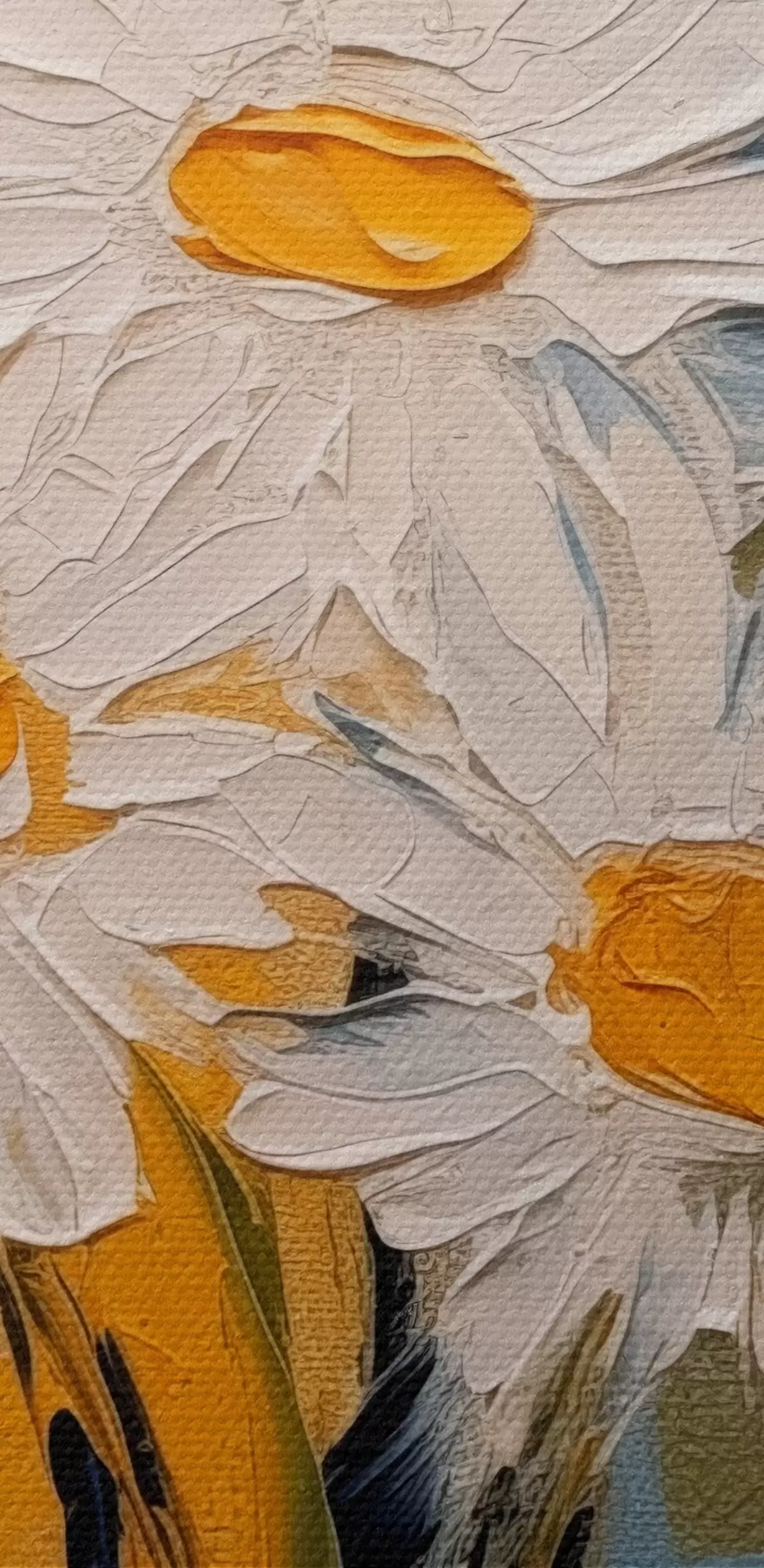 Okrągły obraz Białe stokrotki w szklanym wazonie na niebiesko-żółtym tle, imitacja malarstwa olejnego, duże pociągnięcia Nr r38907