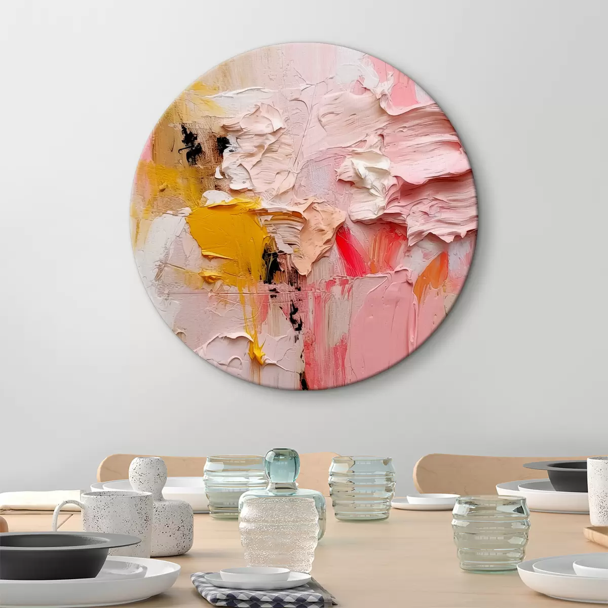 Okrągły obraz Abstrakcyjny ekspresjonizm dużych pociągnięć farby w kolorze różowym, żółtym i białym Nr r38916