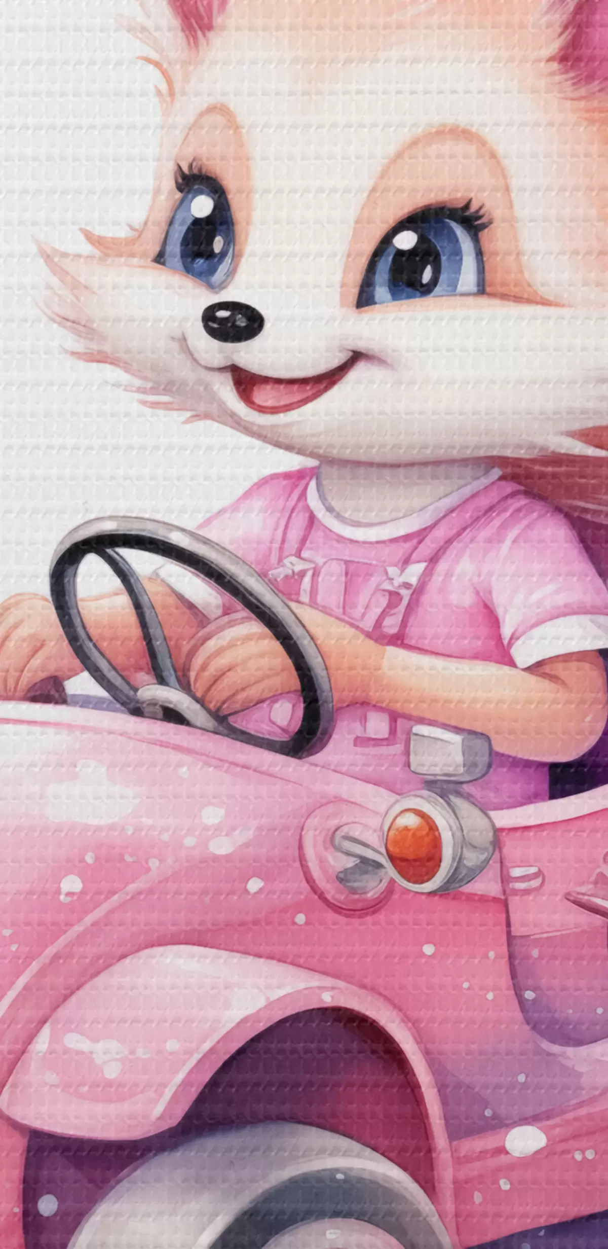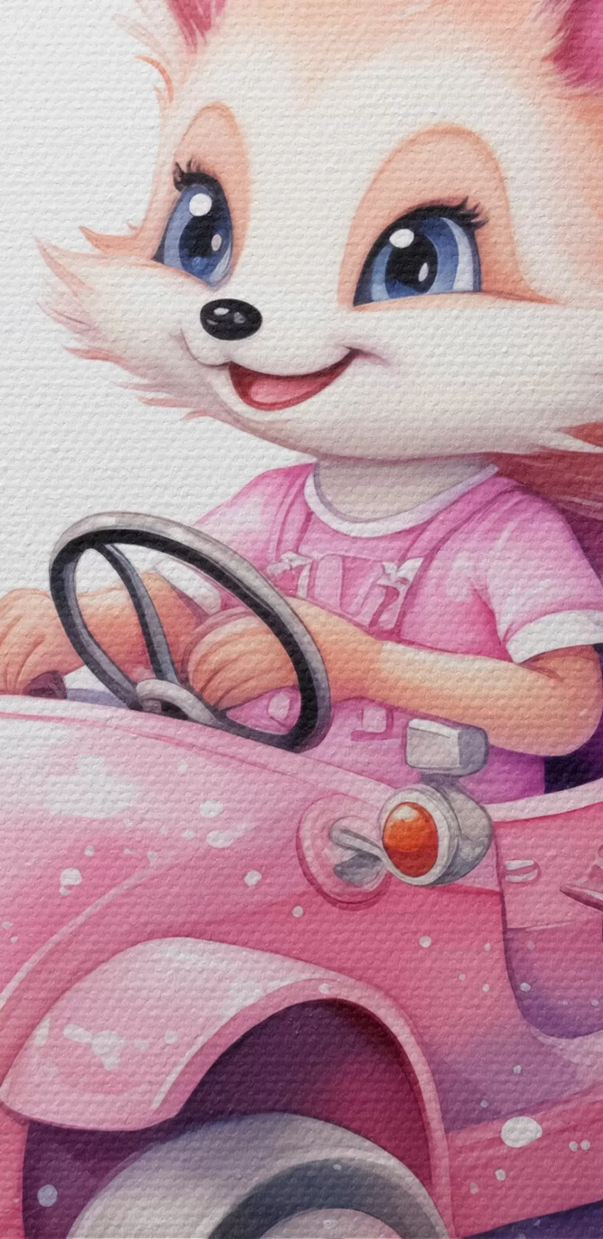 Okrągły obraz Mały lis jedzie różowym samochodem. Akwarela ilustracja dla dzieci Nr r38943