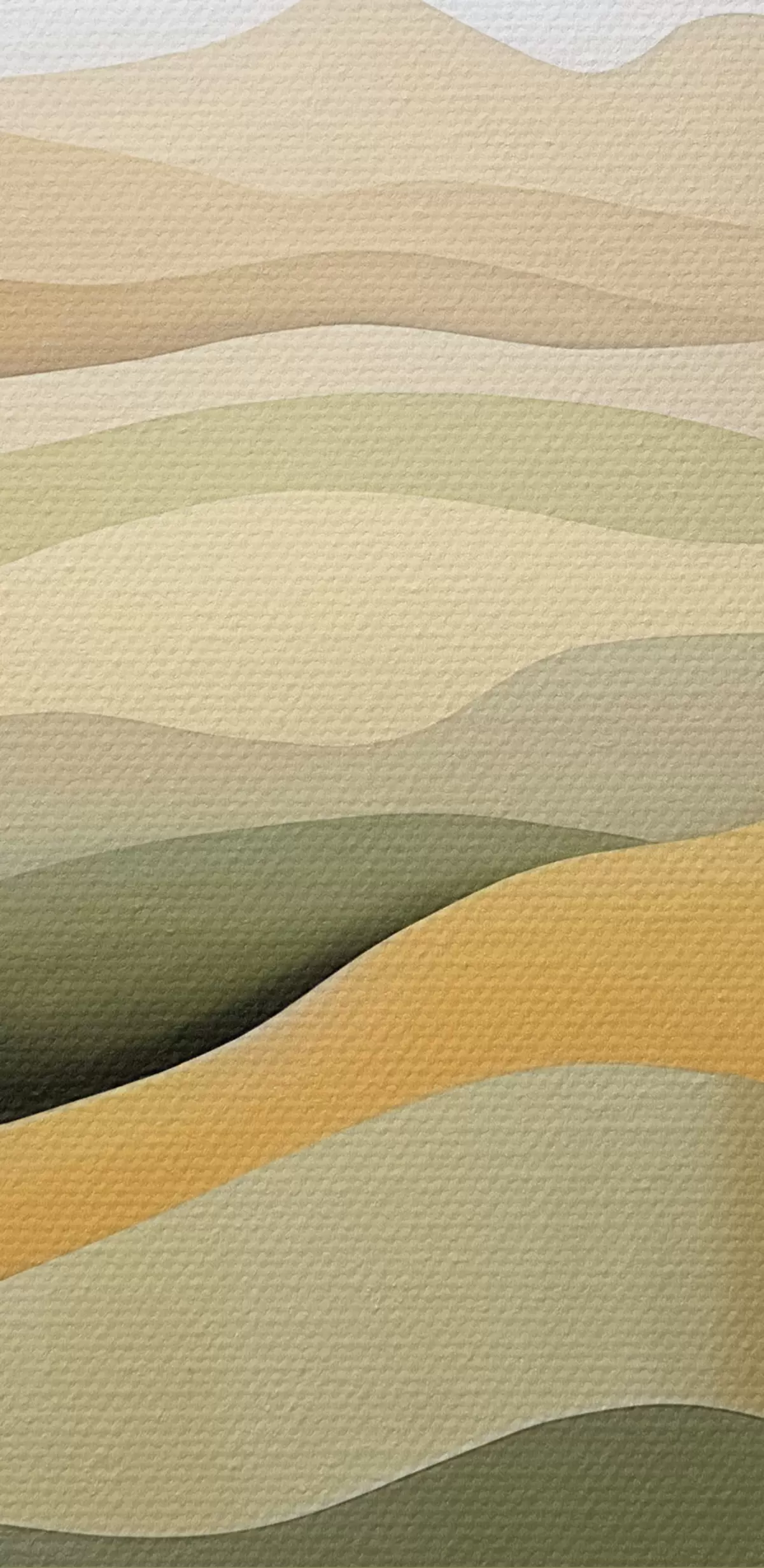 Okrągły obraz Wzgórza, abstrakcyjny krajobraz, gwasz, zieleń, ochra, sepia, szarość Nr r38952