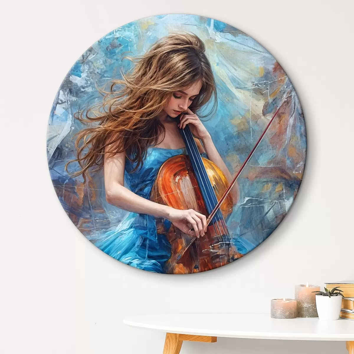 Okrągły obraz Malarstwo olejne przedstawiające młodą kobietę o długich, rozwianych rudych włosach grającą na wiolonczeli na abstrakcyjnym tle Nr r38956