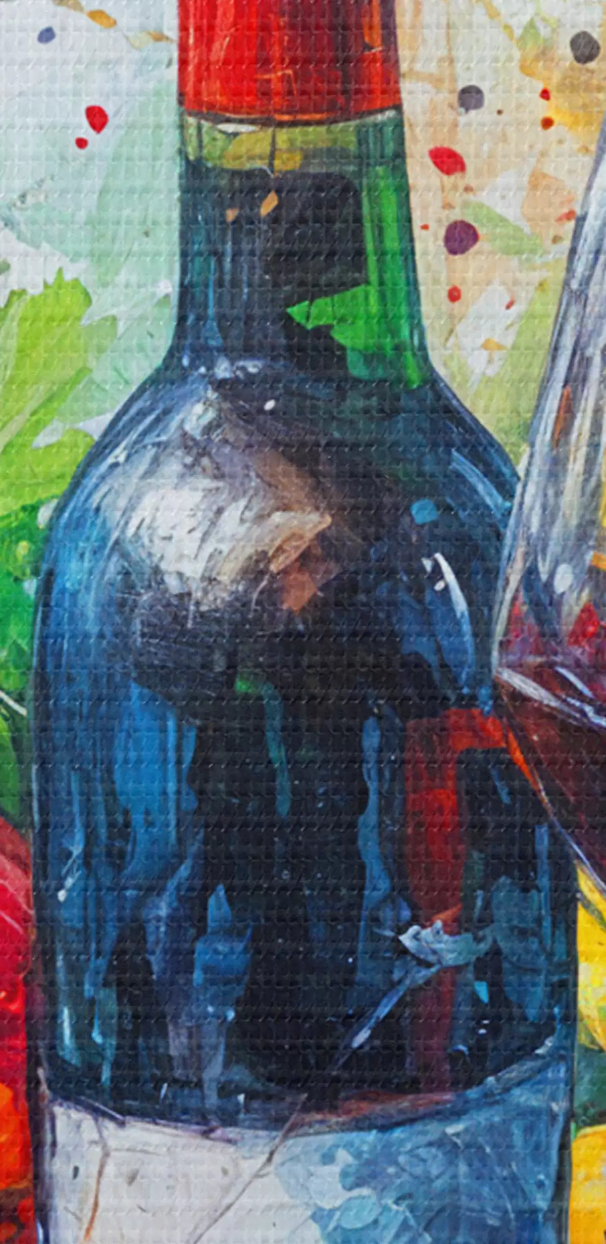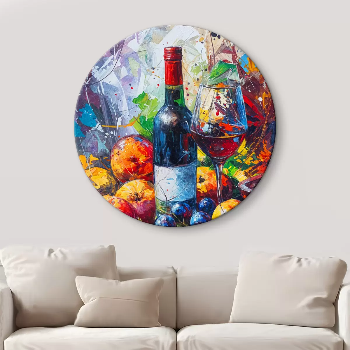 Okrągły obraz Abstrakcyjny obraz martwej natury przedstawiający butelkę wina, kieliszek wina i kolorowe owoce z plamami w różnych kolorach Nr r38958