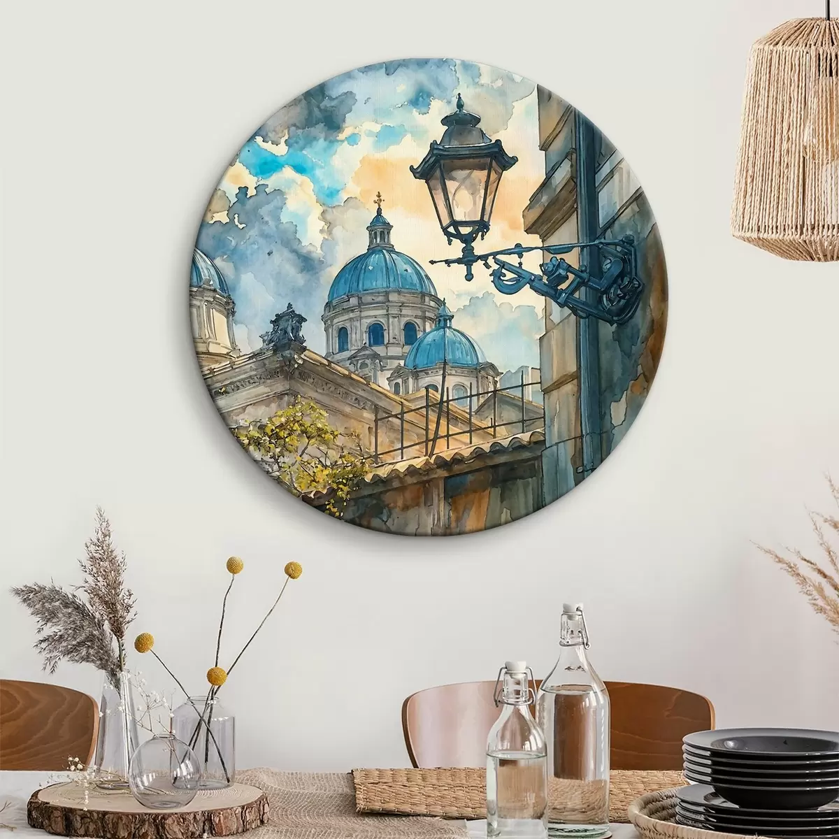 Okrągłe obrazy Akwarela przedstawiająca budynki na panoramie miasta i dramatyczne pochmurne niebo. r38961