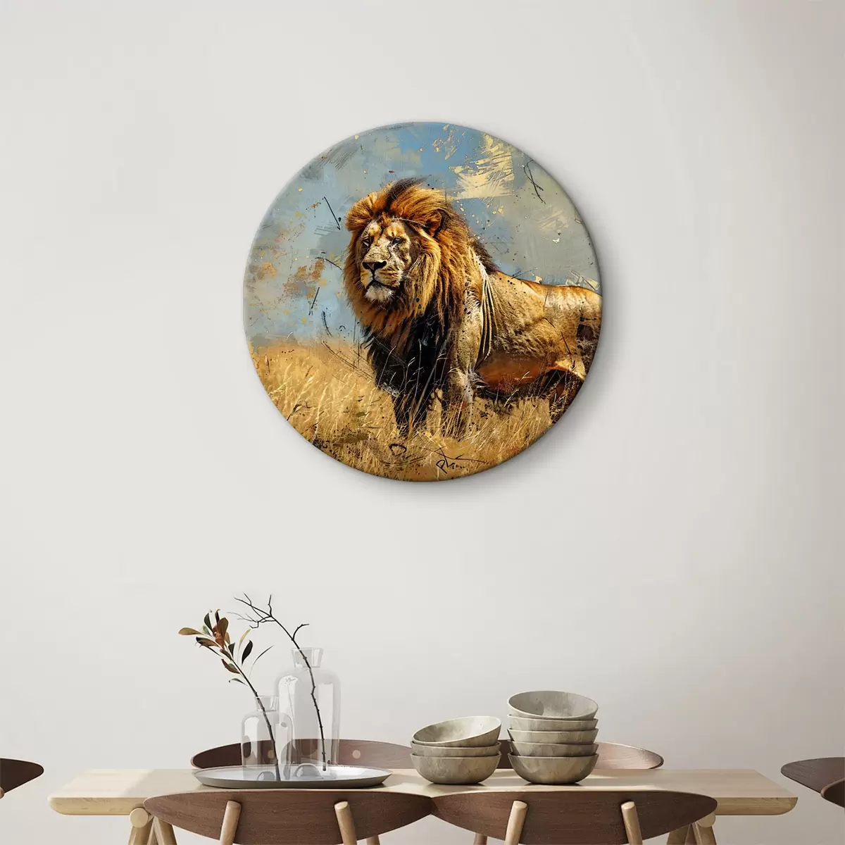 Okrągły obraz Duży samiec lwa z grubą, ciemną grzywą stojący na trawiastym polu na tle pochmurnego nieba Nr r38962