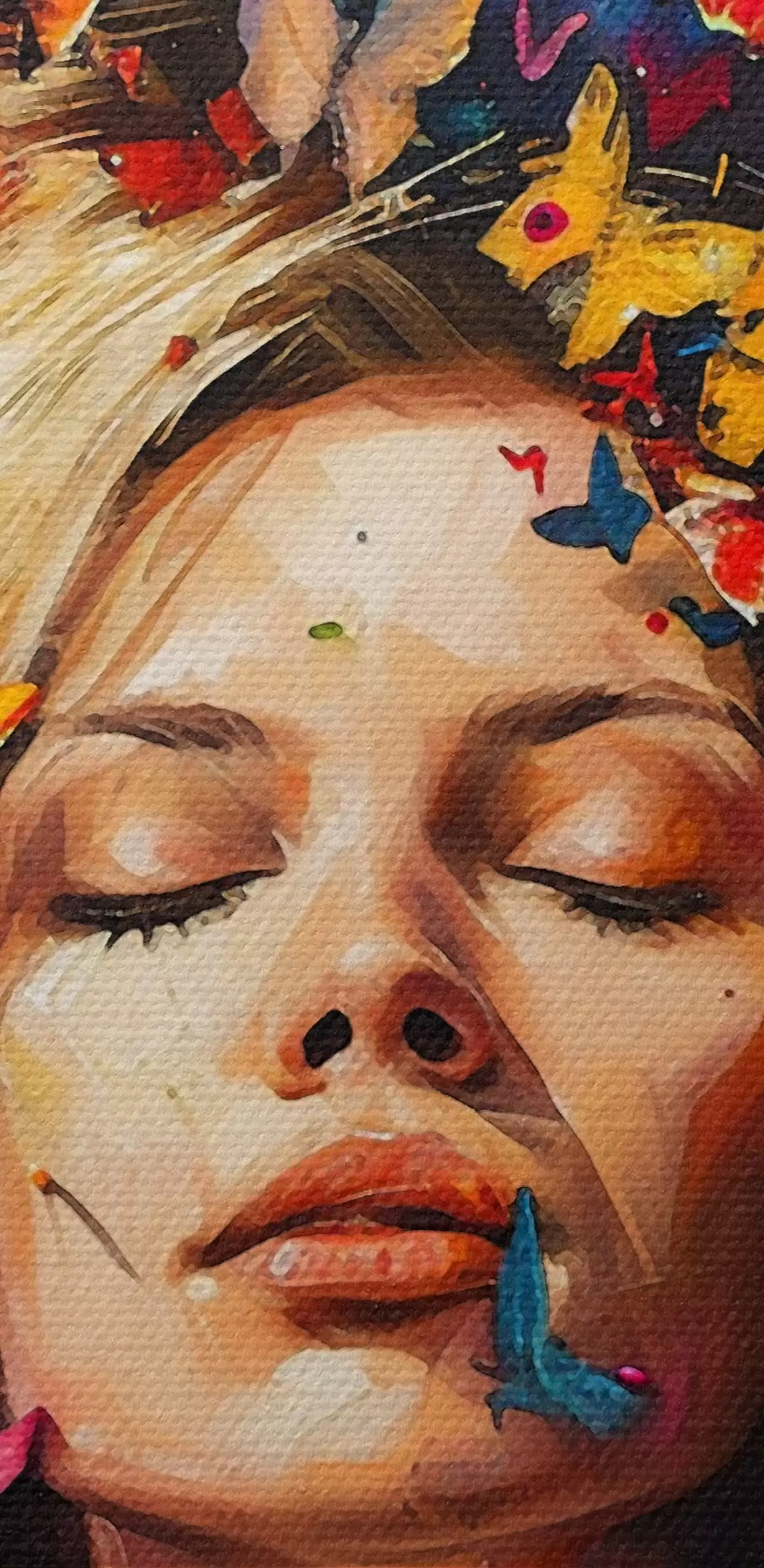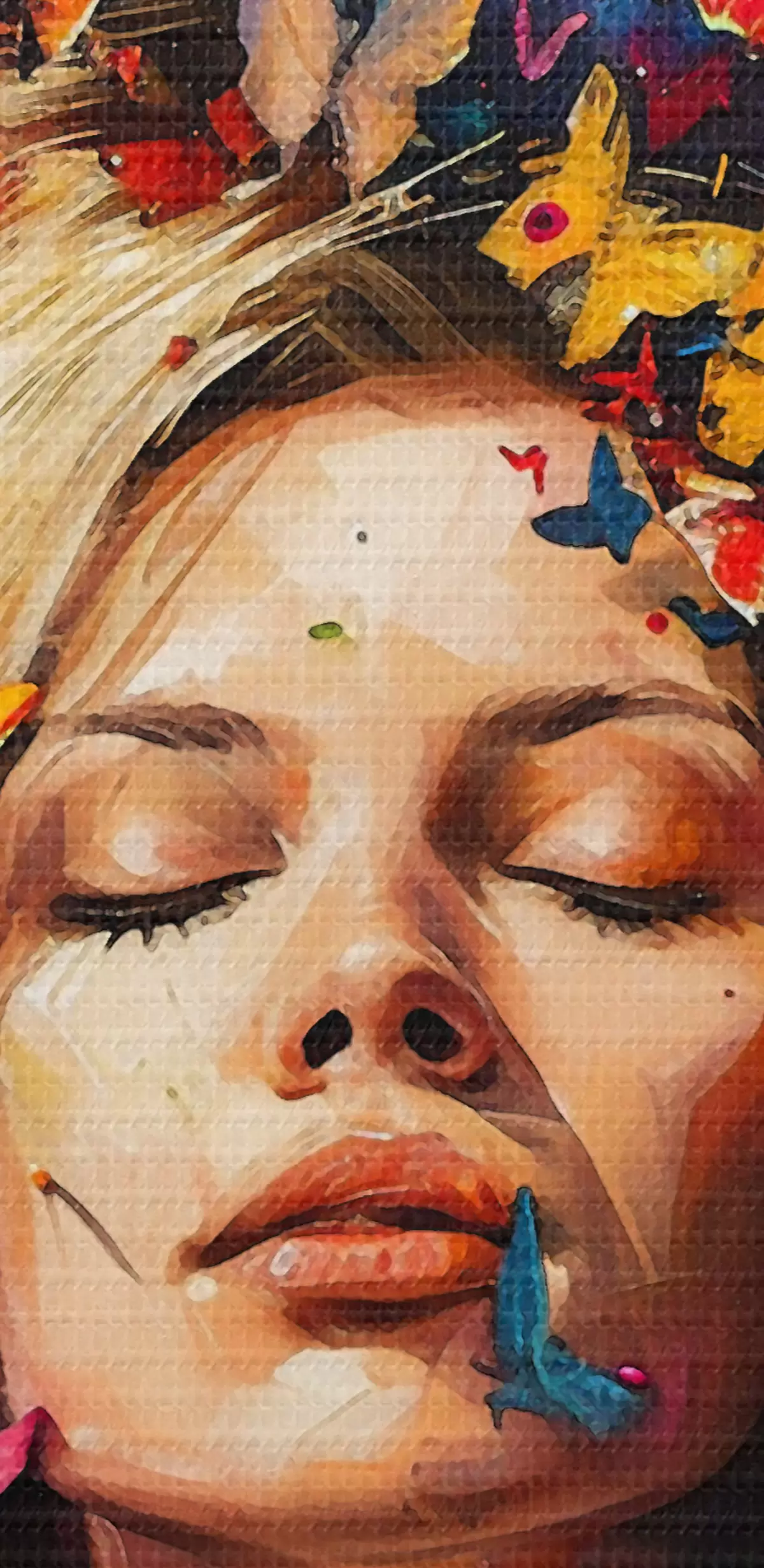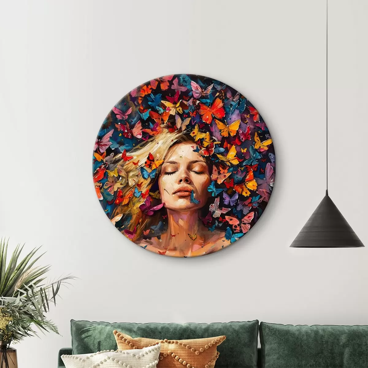 Okrągły obraz Obraz olejny przedstawiający młodą kobietę otoczoną rojem kolorowych motyli na ciemnym tle Nr r38972