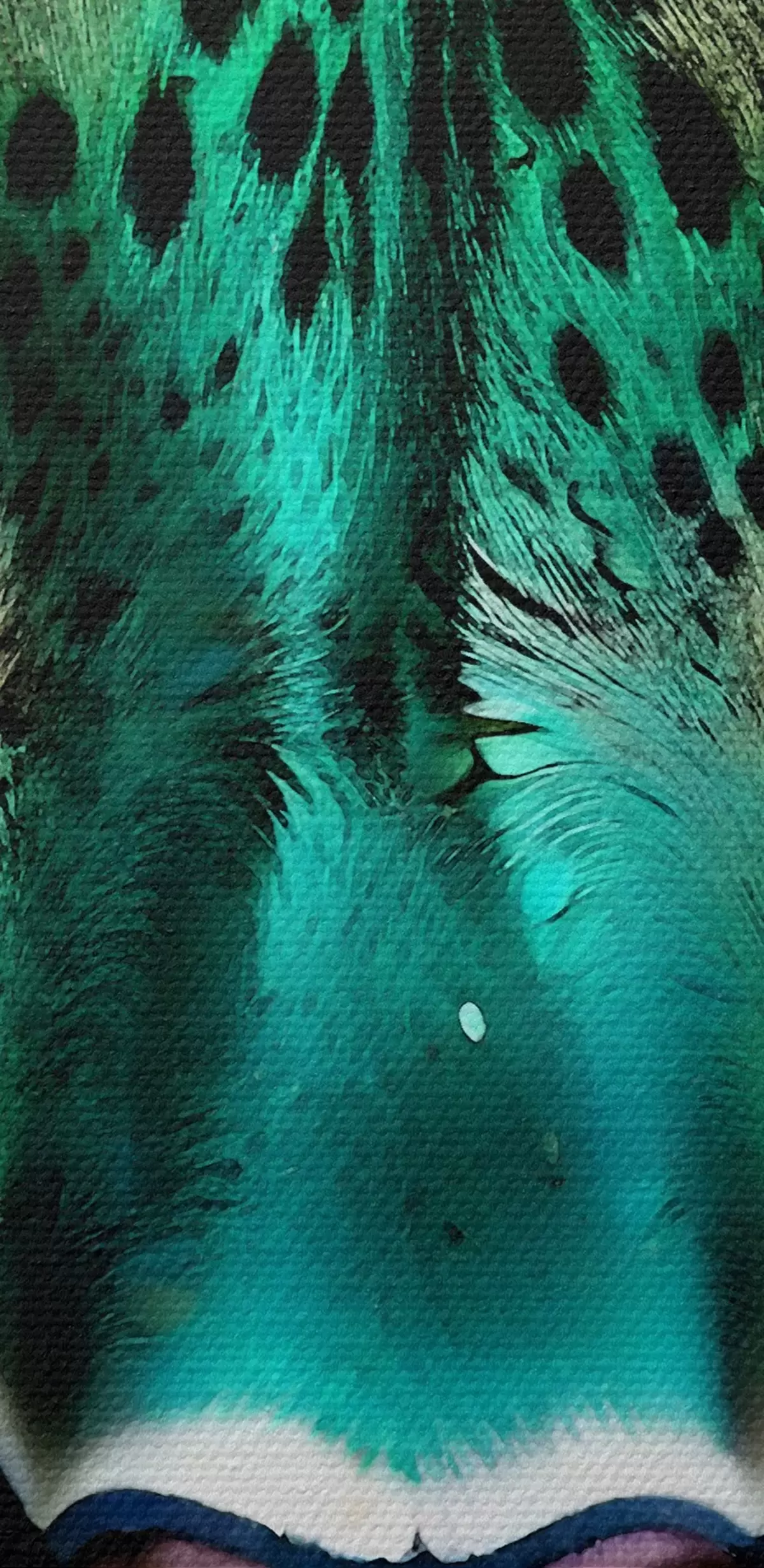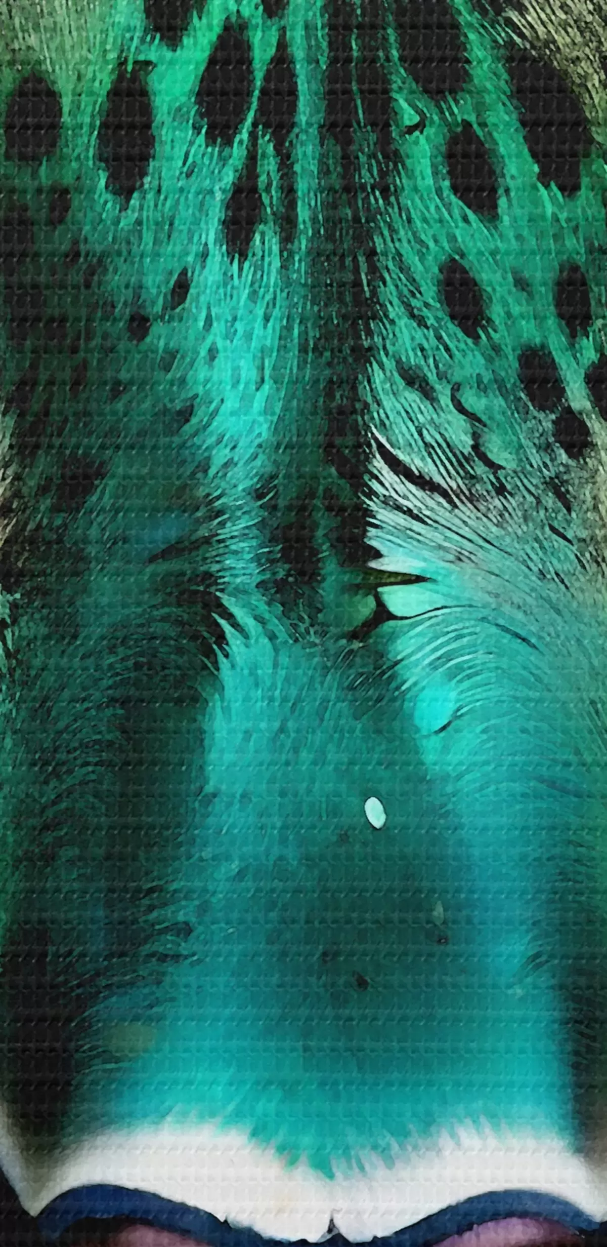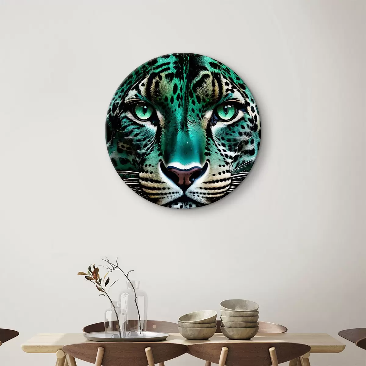 Okrągły obraz Zbliżony portret groźnego zielonookiego lamparta z żywym turkusowym i czarnym cętkowanym futrem Nr r38979