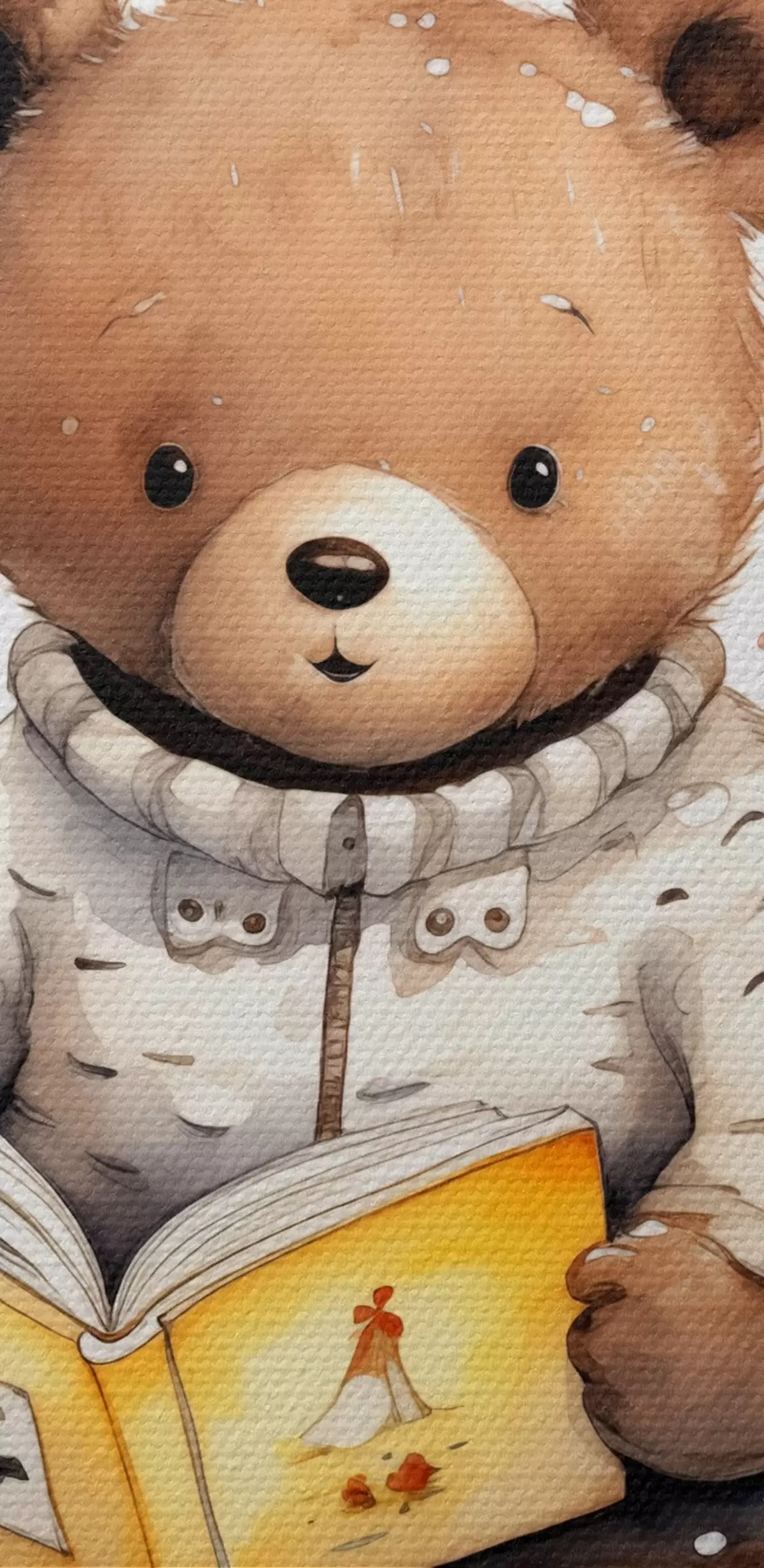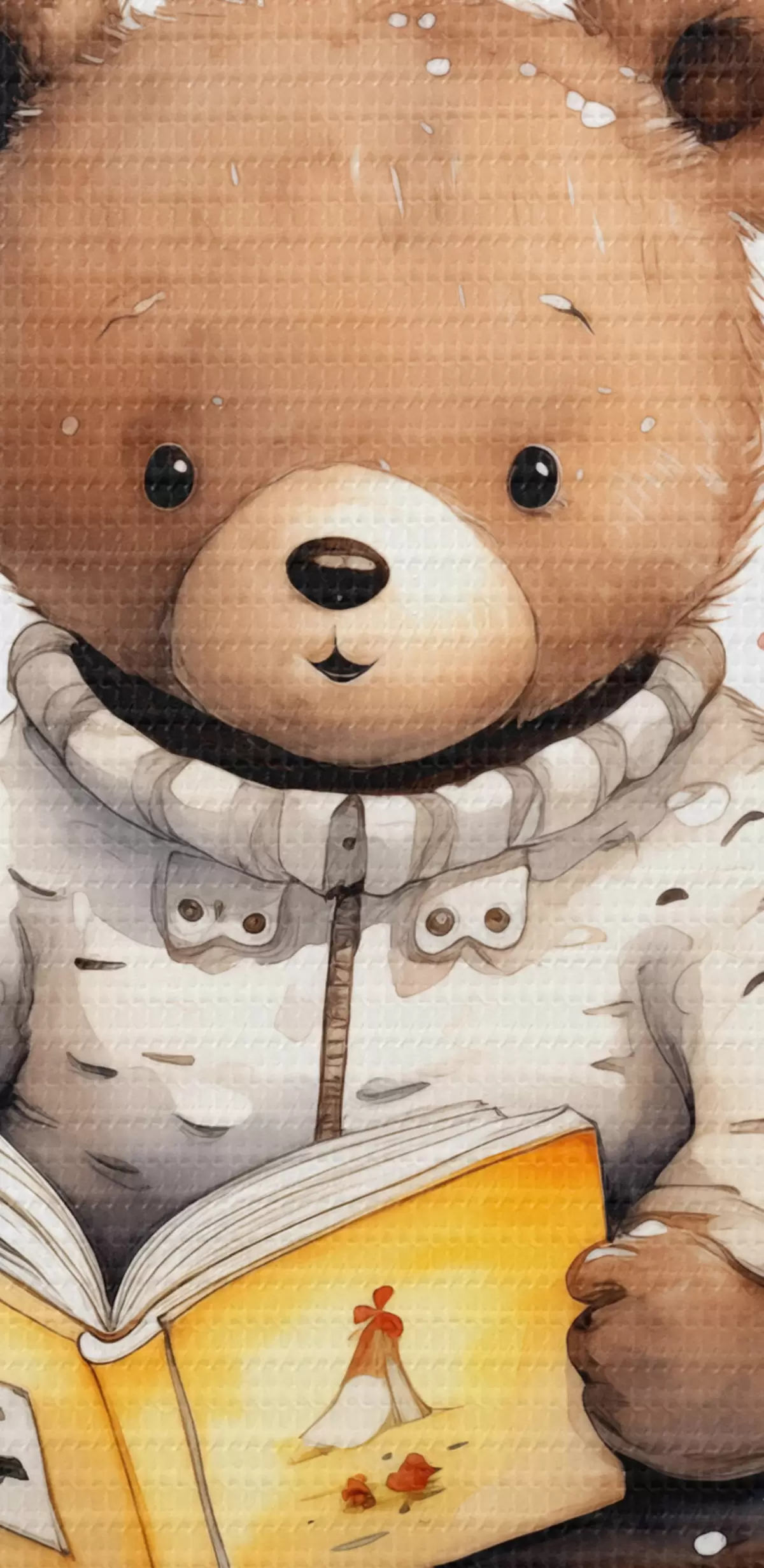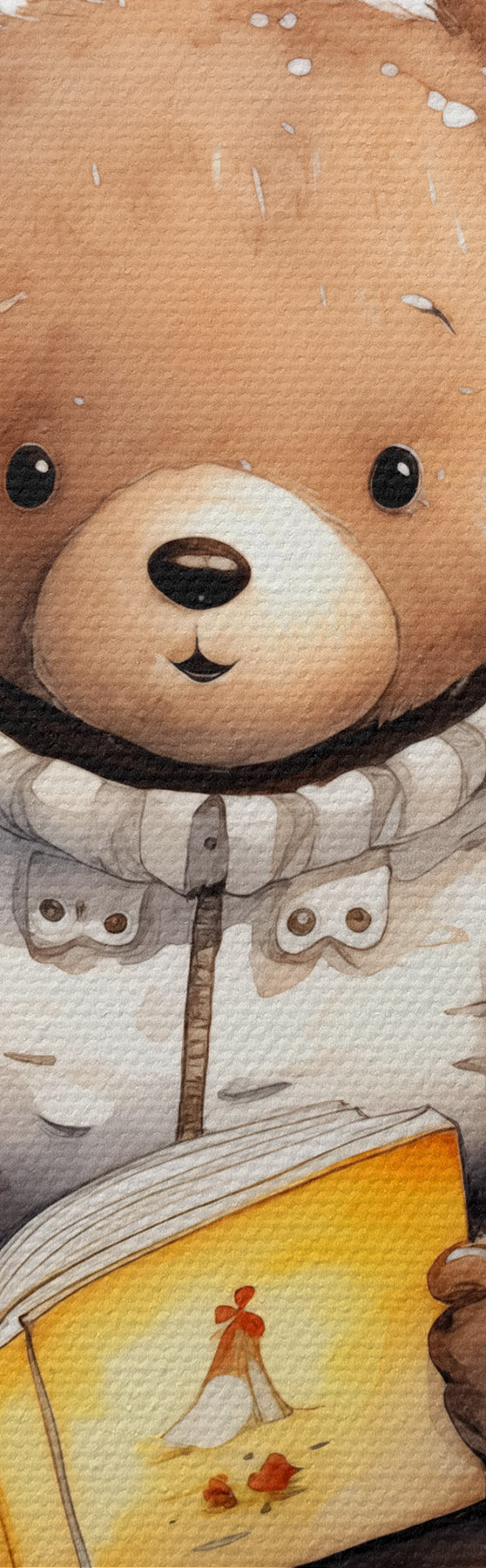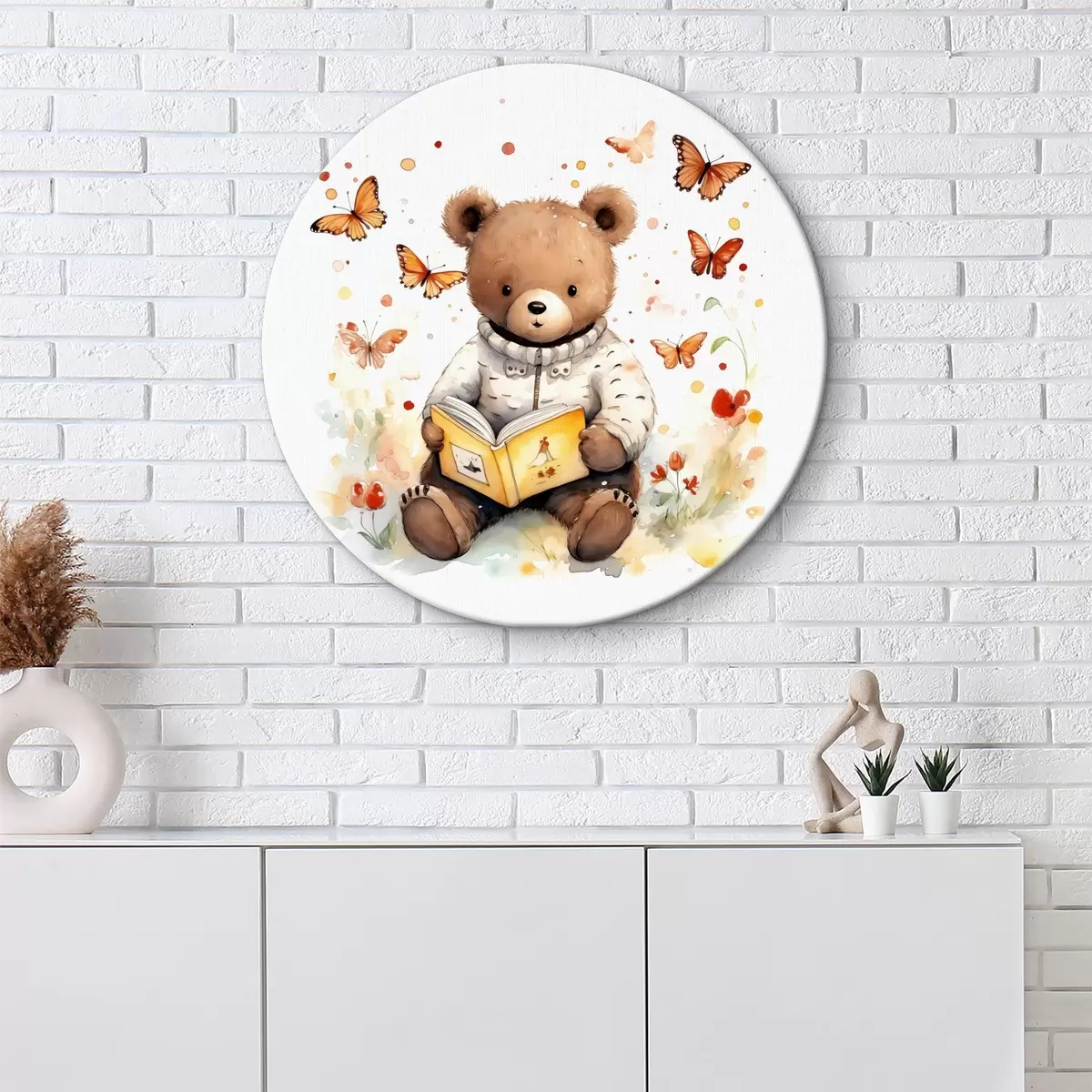 Okrągły obraz Niedźwiedź brunatny w swetrze czyta książkę otoczoną akwarelowymi motylami Nr r39025