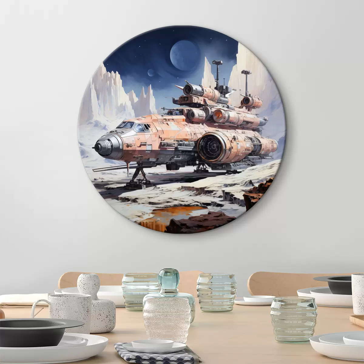 Okrągły obraz Statek kosmiczny w stylu cyberpunkowym stoi na powierzchni Księżyca w kosmosie wśród gór, kolor niebieski, beżowy, biały Nr r39114