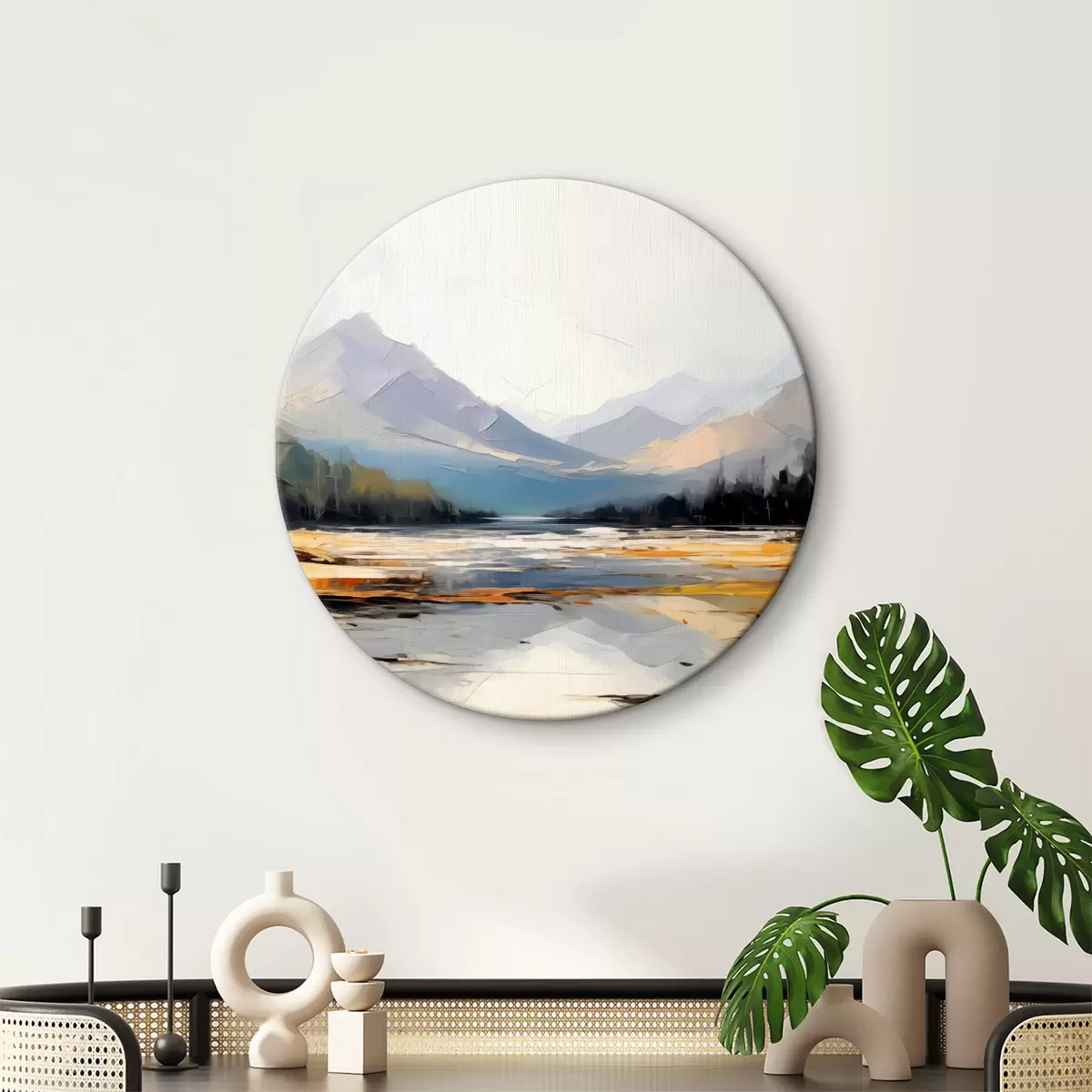 Okrągły obraz Pasma górskie w dolinie obraz olejny, pejzaż, przyroda, kolor niebieski, biały, żółty Nr r39128