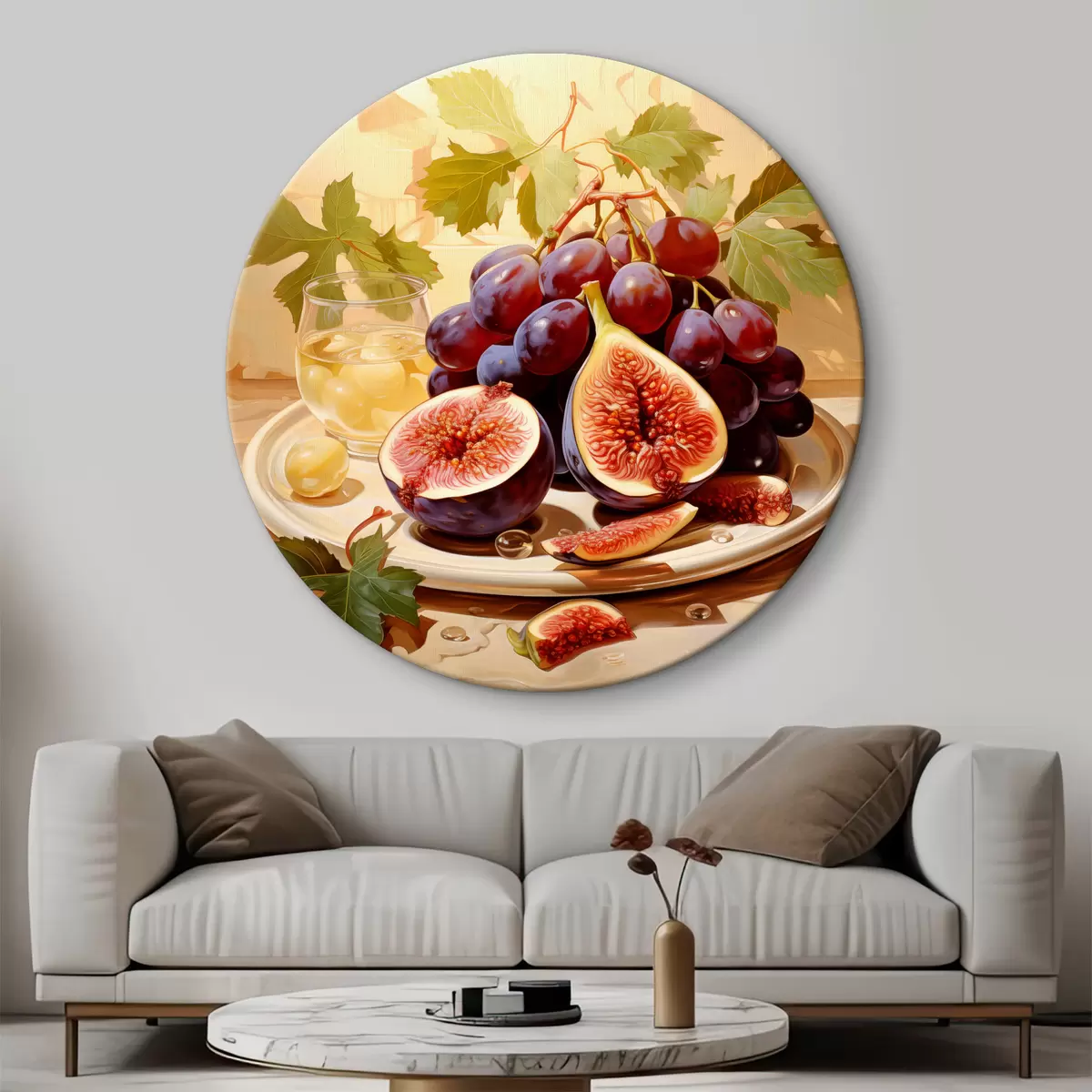 Okrągłe obrazy Martwa natura z niebieskimi winogronami i pociętymi figami na obrazie olejnym na płycie, w kolorze beżowym i różowym r39131