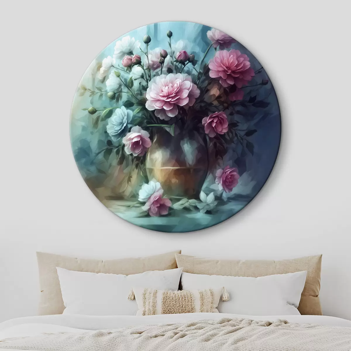 Okrągły obraz Kwiaty w wazonie na zachmurzonym niebieskim tle Nr r39164