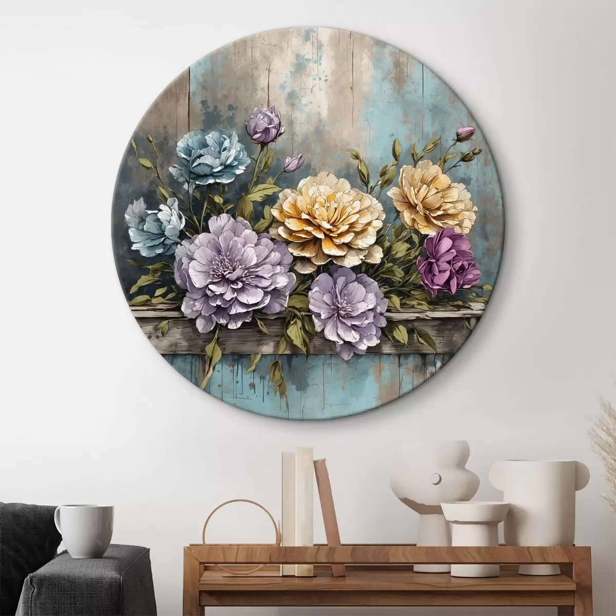 Okrągły obraz Kwiaty i liście na starej drewnianej półce Nr r39169