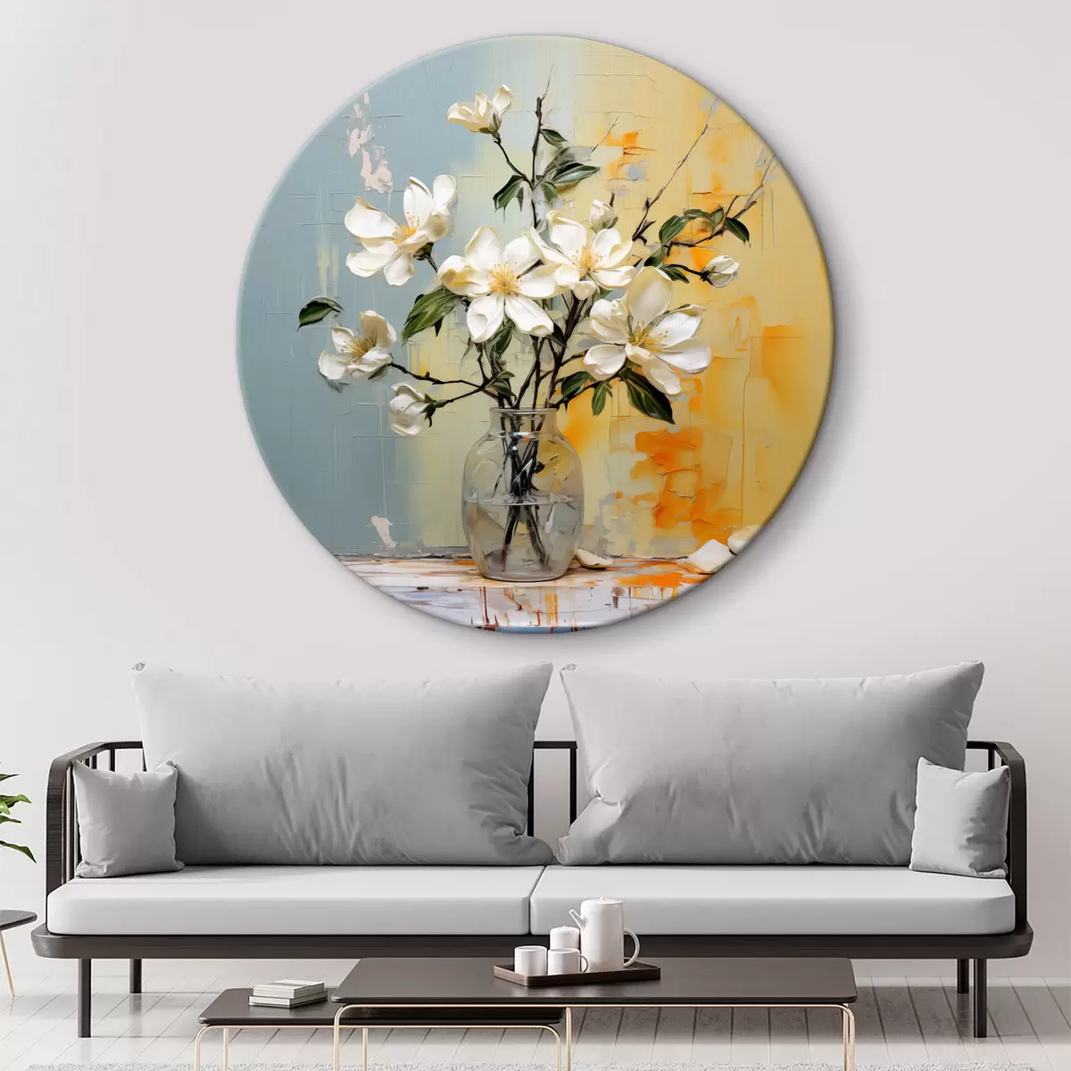 Okrągły obraz Gałązki z białymi kwiatami jaśminu w szklanym wazonie, obraz olejny, sztuka abstrakcyjna, kolor niebieski i żółty Nr r39183