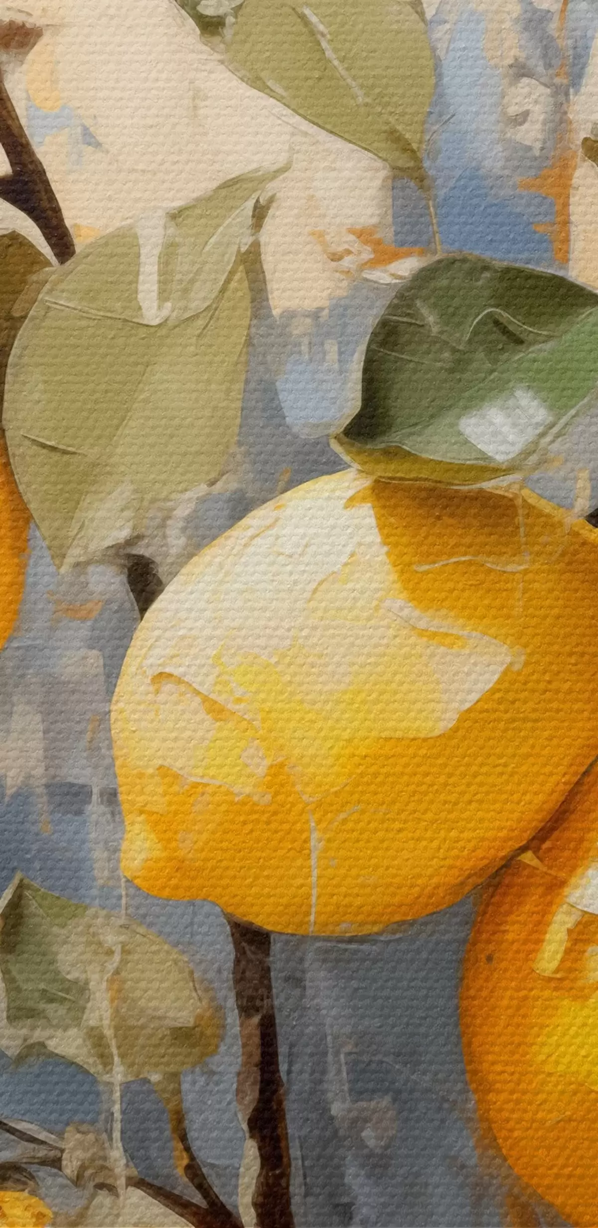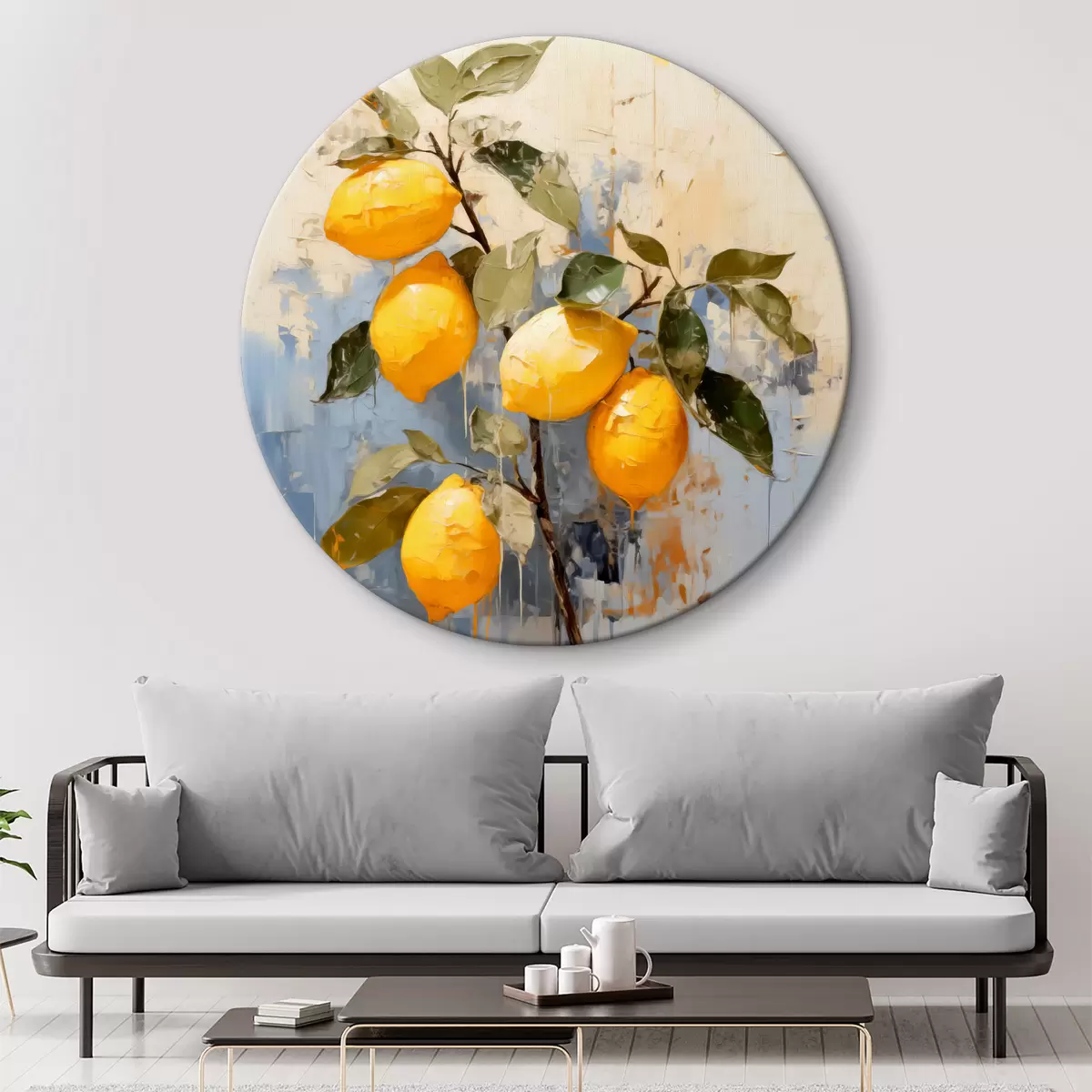 Okrągłe obrazy Gałąź z dojrzałymi cytrynami, obraz olejny, sztuka abstrakcyjna, kolor żółty, niebieski i zielony r39186