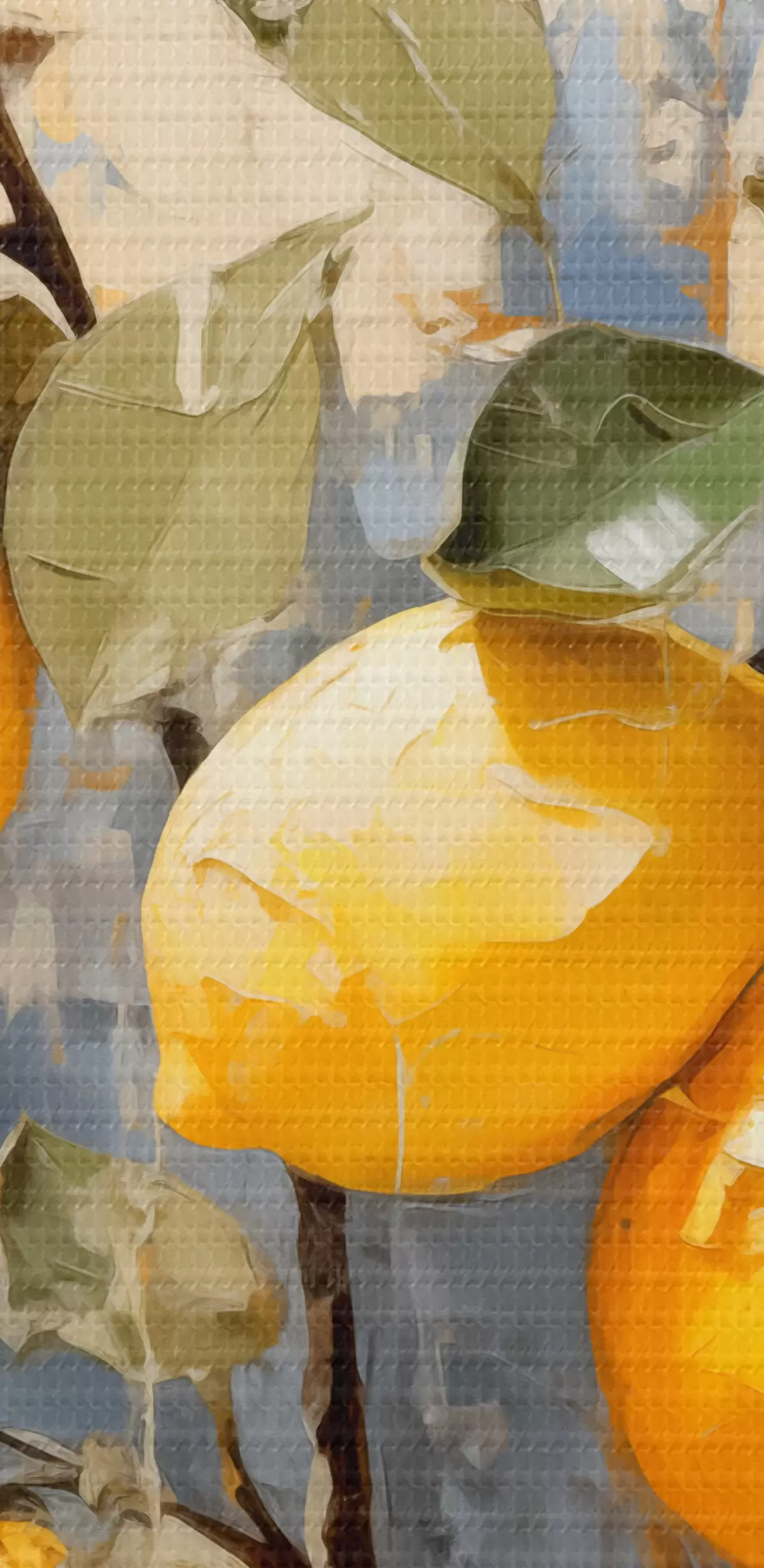 Okrągły obraz Gałąź z dojrzałymi cytrynami, obraz olejny, sztuka abstrakcyjna, kolor żółty, niebieski i zielony Nr r39186