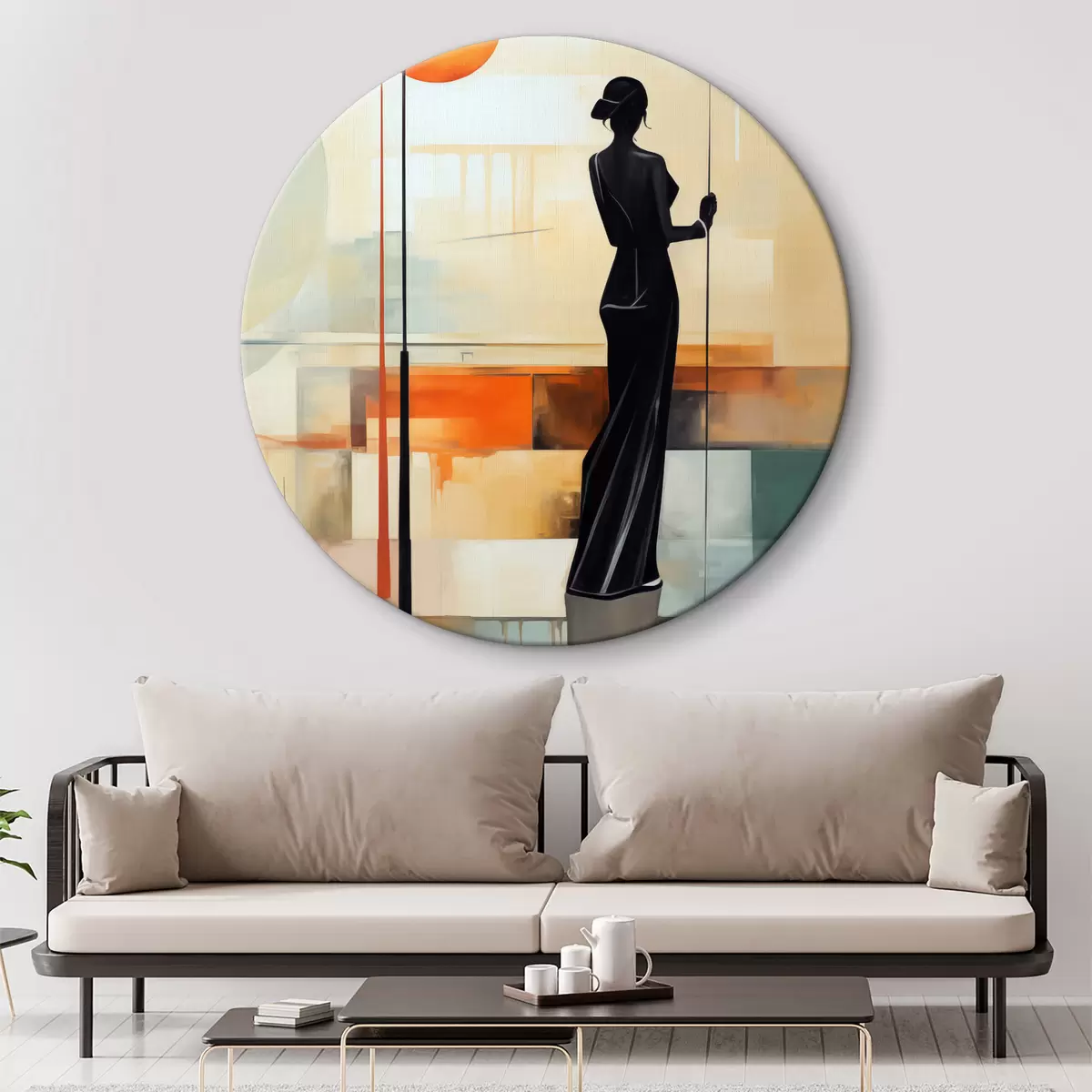 Okrągłe obrazy Czarna kobieca sylwetka z kijem bilardowym w rękach, malarstwo kubistyczne, kolor niebieski, beżowy, żółty r39197