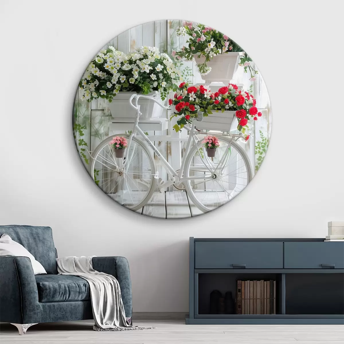 Okrągłe obrazy Kosz rowerowy i kwiatowy w stylu prowansalskim r39242