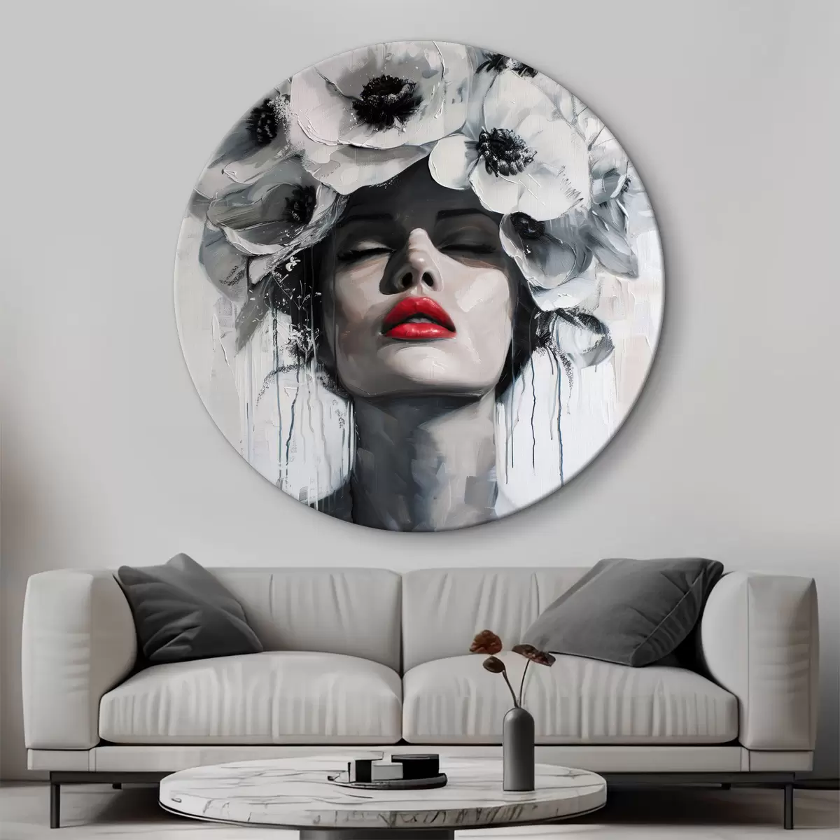 Okrągły obraz Portret kobiety z kwiatami we włosach i czerwonymi ustami Nr r39253