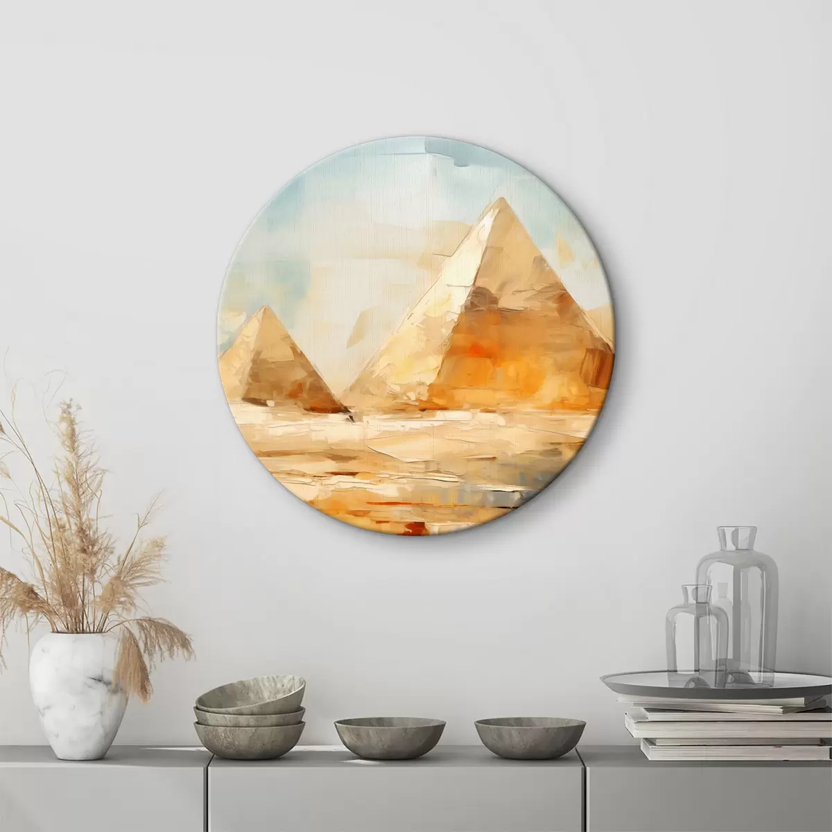 Okrągłe obrazy Dwie egipskie piramidy na pustyni na tle obrazu olejnego błękitnego nieba r39330