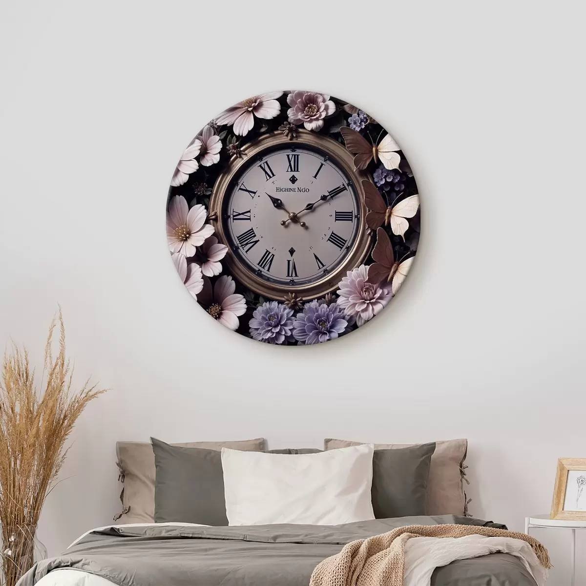Okrągły obraz Antyczny zegar otoczony pięknymi fioletowymi i różowymi kwiatami na ciemnym tle Nr r39386