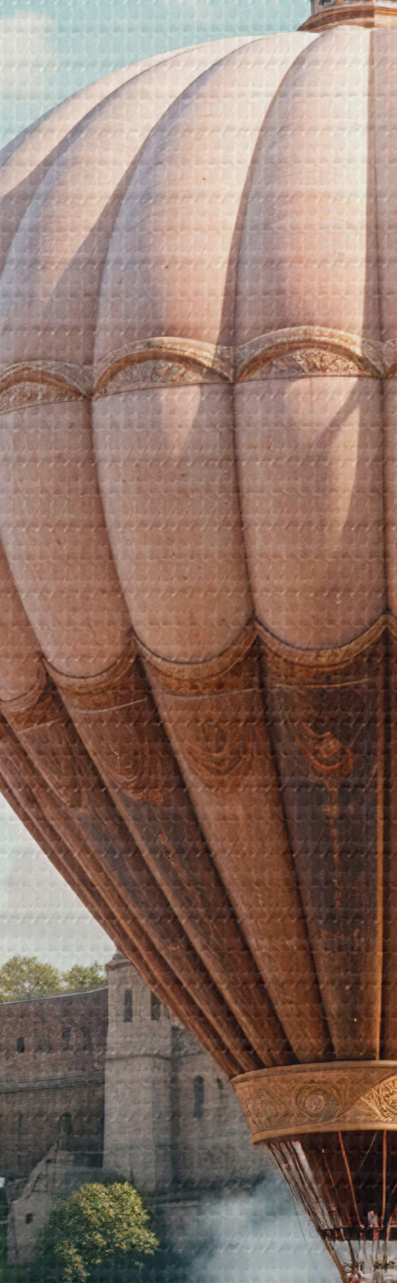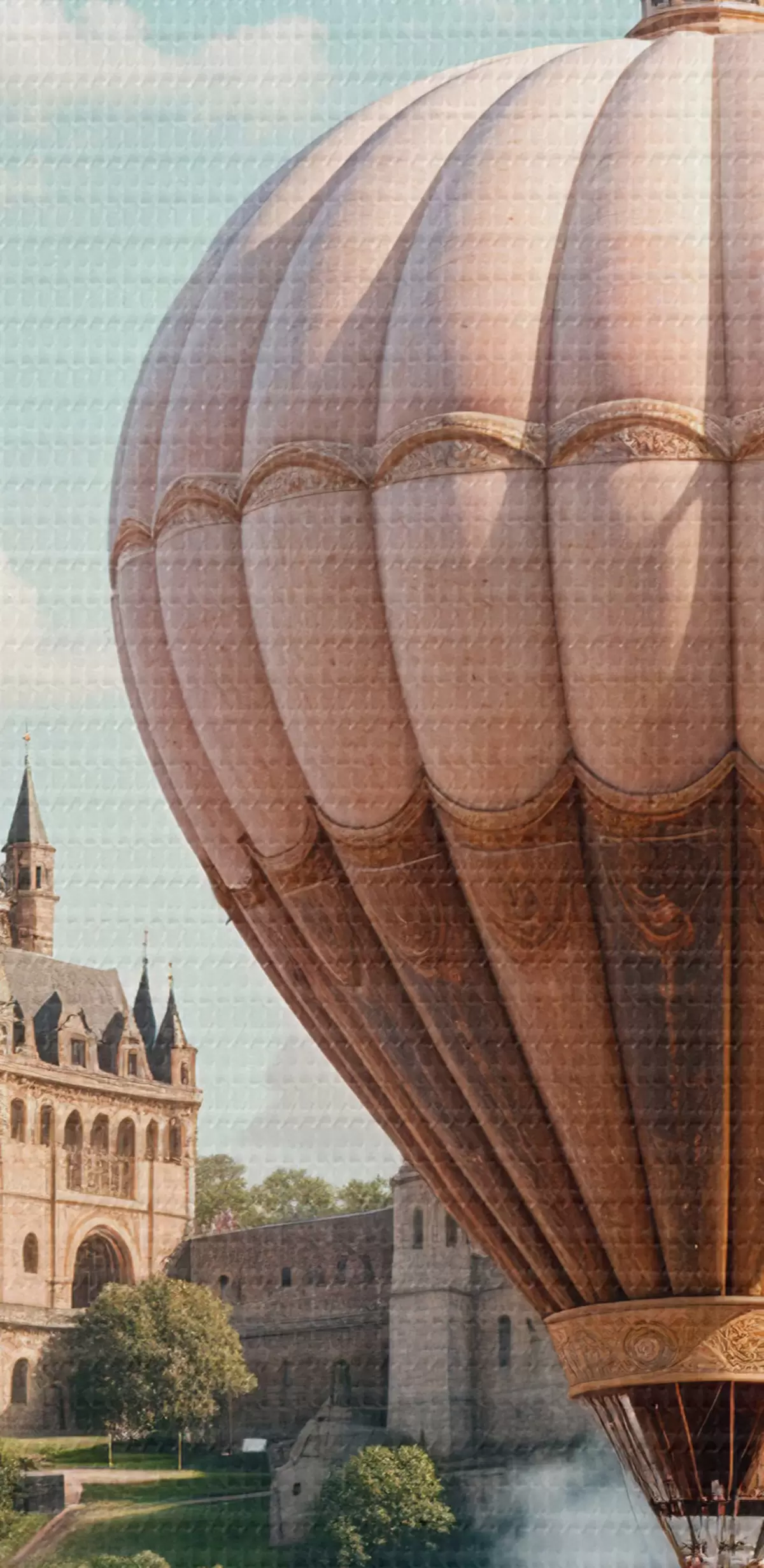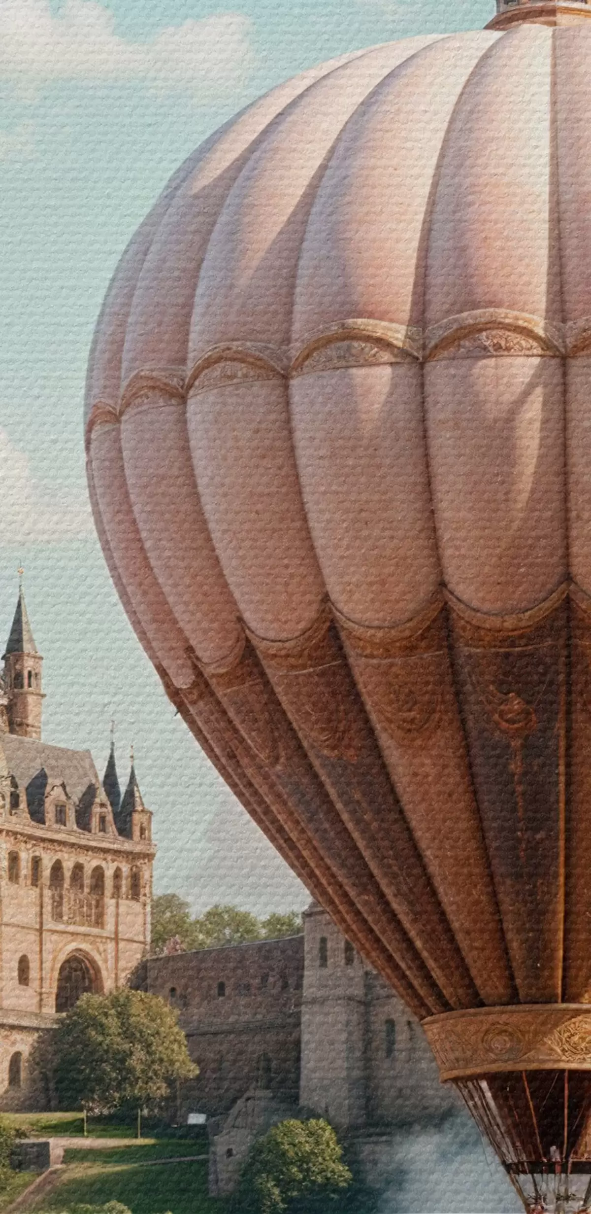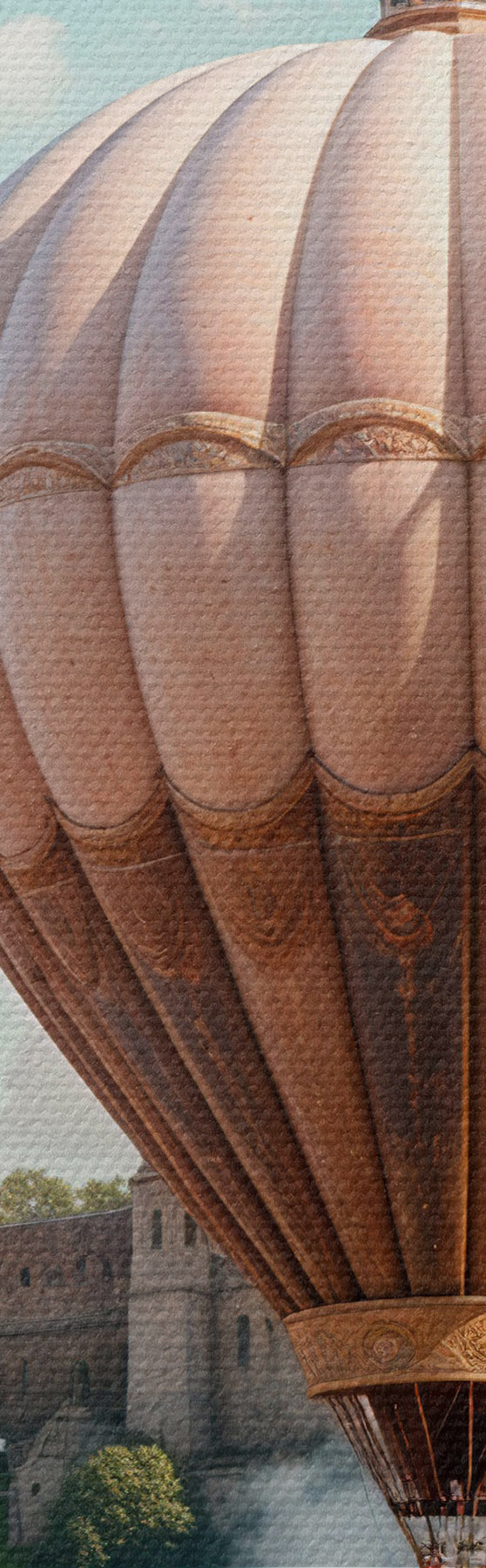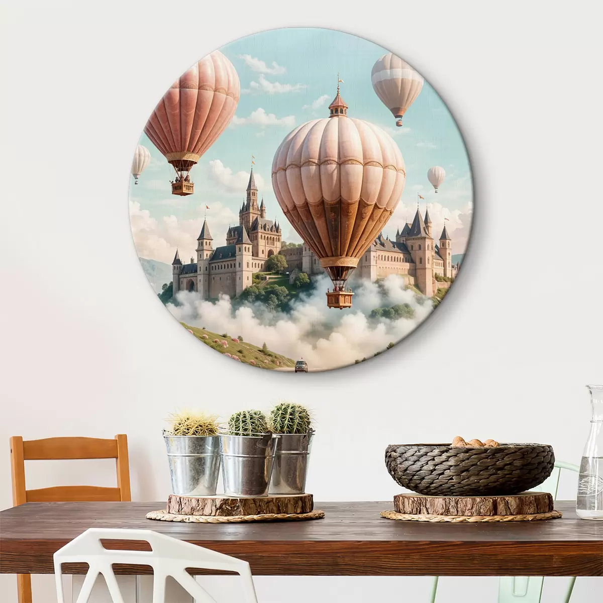 Okrągły obraz Fantazyjny zamek otoczony różowymi balonami na ogrzane powietrze unoszącymi się na pochmurnym niebie nad bujnym, zielonym krajobrazem Nr r39387