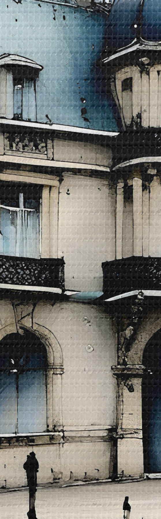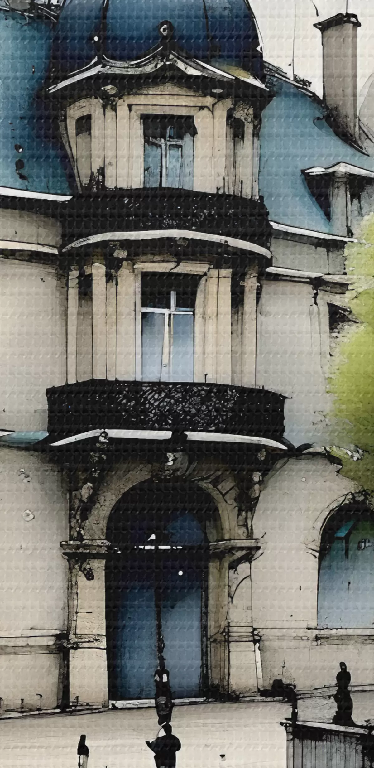 Okrągły obraz Wielki budynek akwareli otoczony latarniami i drzewami w deszczowy dzień Nr r39391