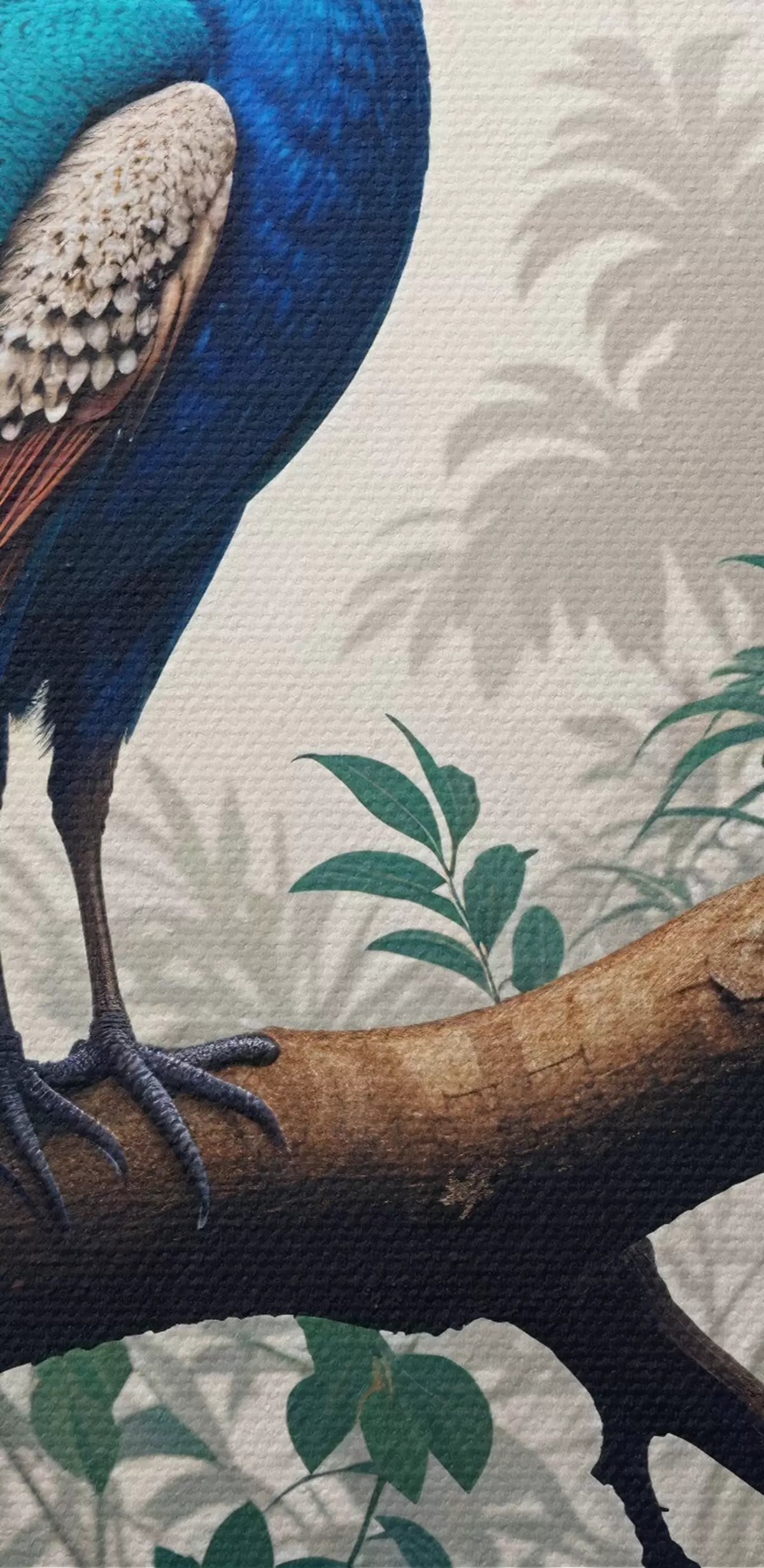 Okrągłe obrazy Żywy niebieski paw siedzący na gałęzi drzewa w bujnym, tropikalnym lesie r39401