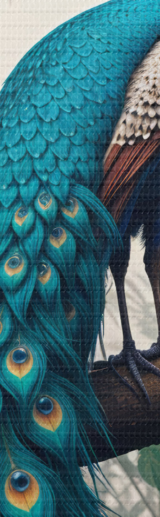 Okrągły obraz Żywy niebieski paw siedzący na gałęzi drzewa w bujnym, tropikalnym lesie Nr r39401