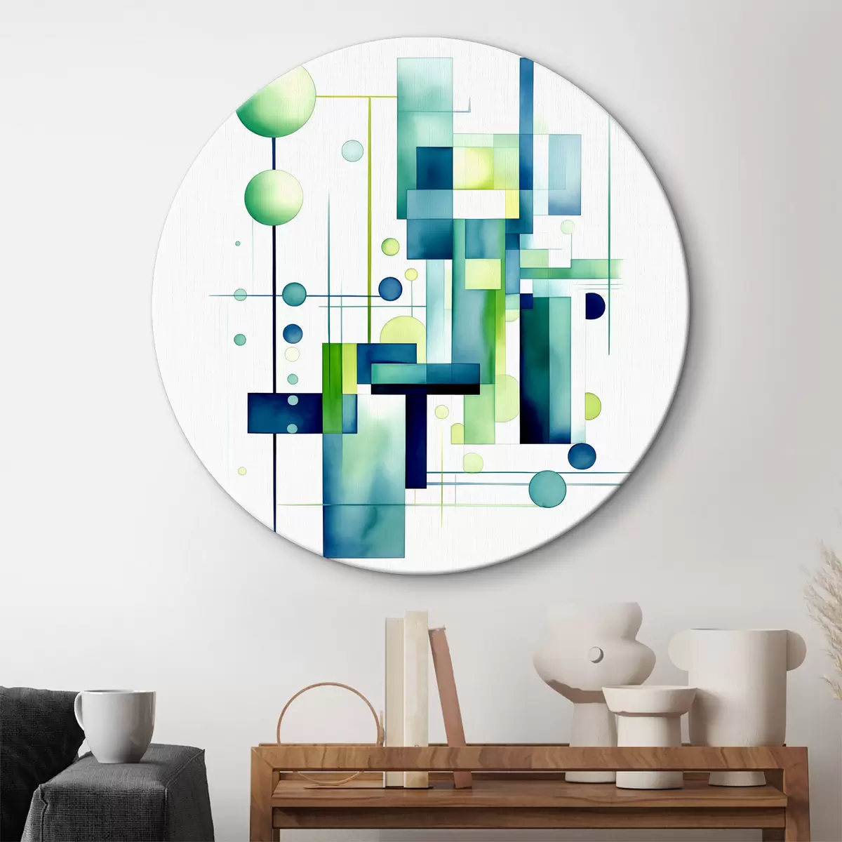 Okrągły obraz Abstrakcyjna geometryczna kompozycja akwarelowa, styl boho, kolor zielony i niebieski Nr r39430