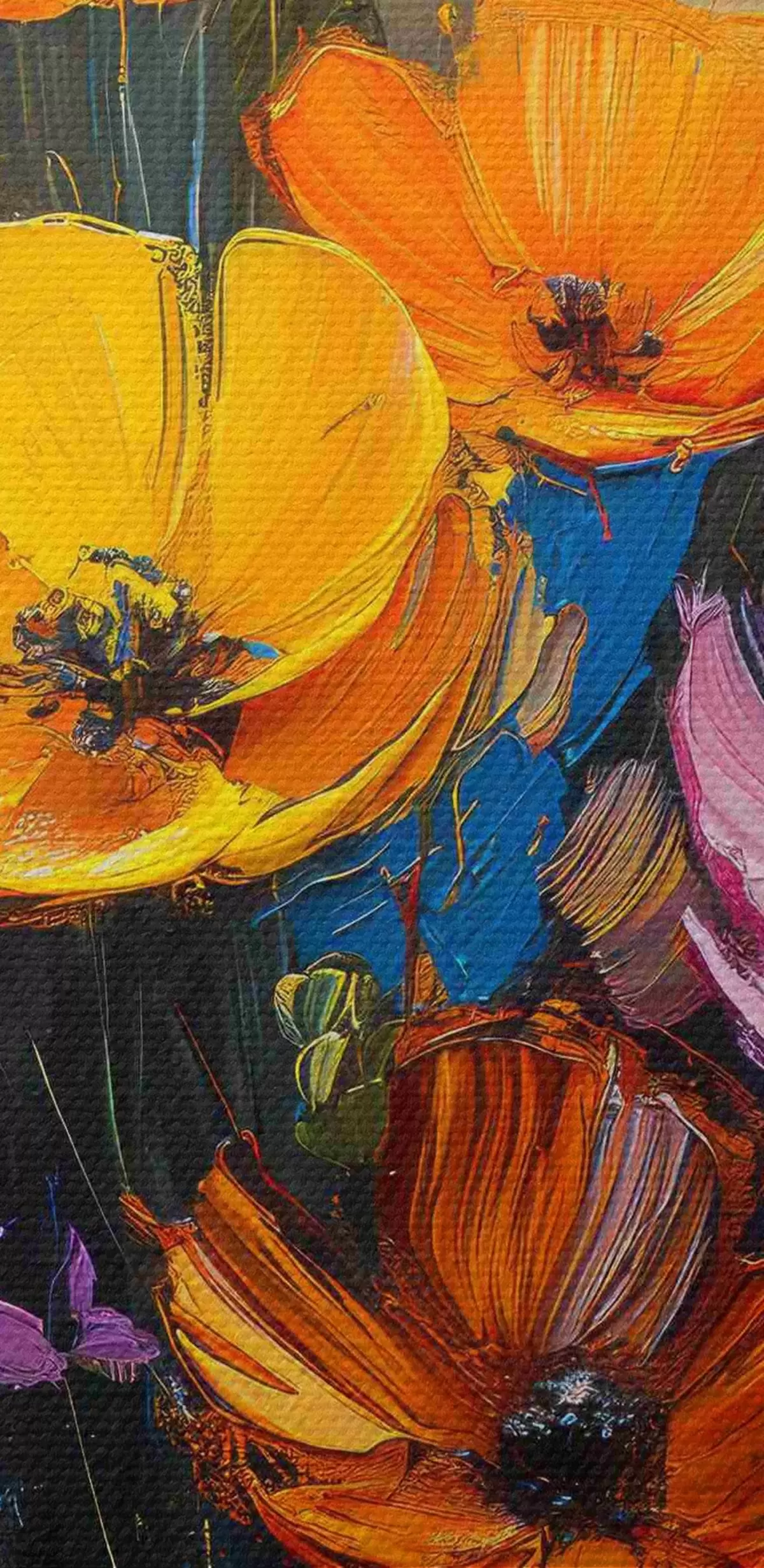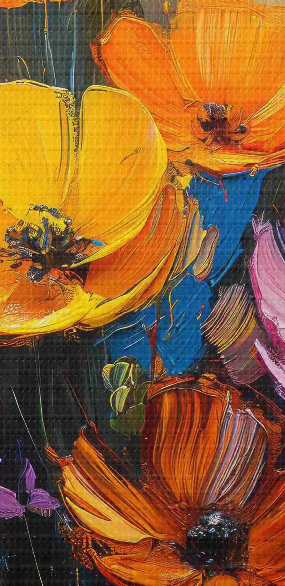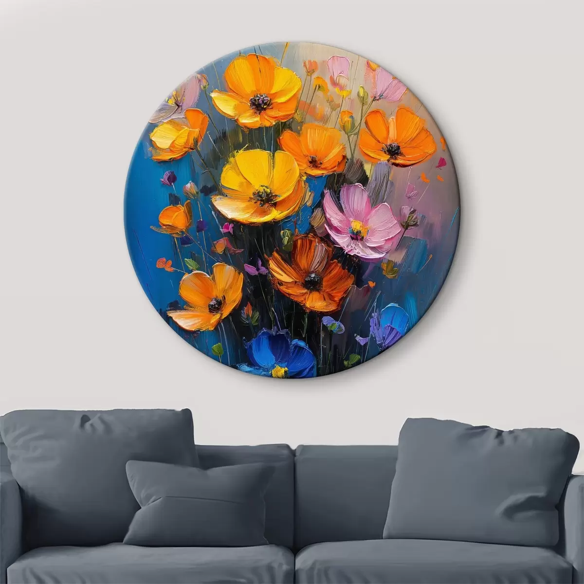 Okrągły obraz Malowana symfonia: jasnożółte, pomarańczowe, różowe i niebieskie pociągnięcia pędzla maków Nr r39454