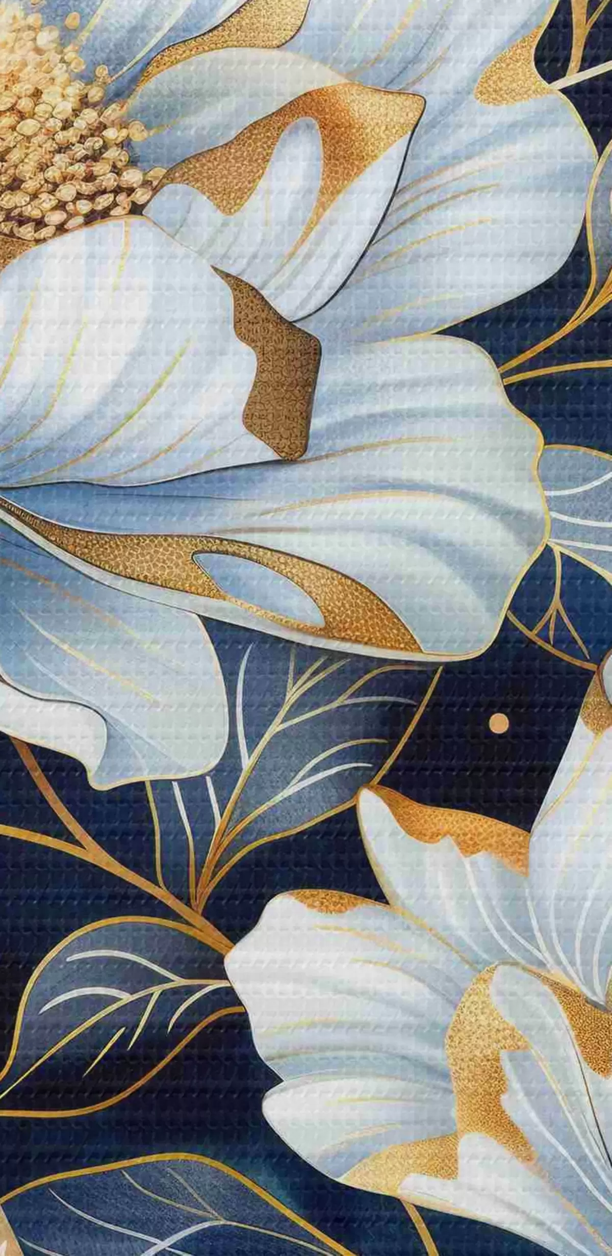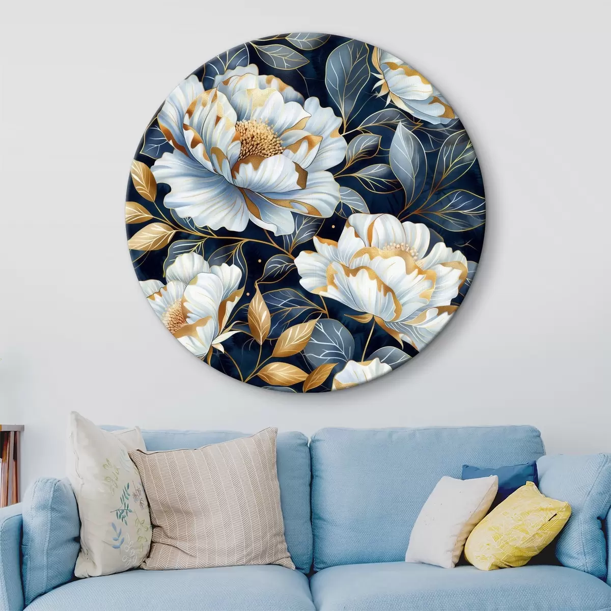 Okrągły obraz Białe piwonie i róże z konturami, niebieskie liście i kwiatowe wzory w tle Nr r39457