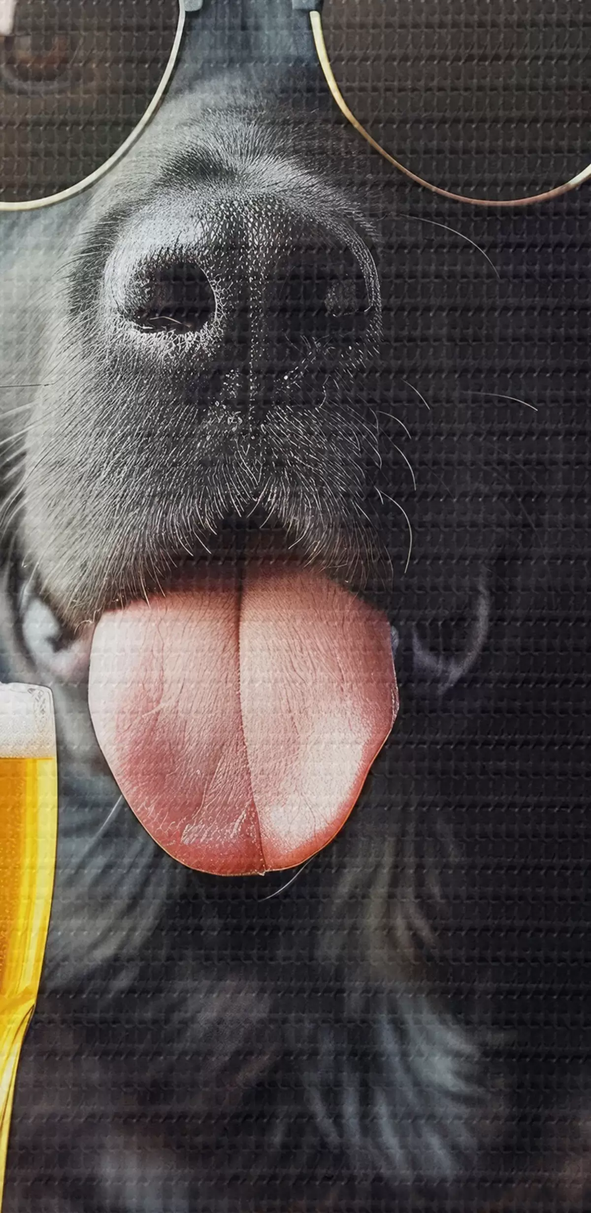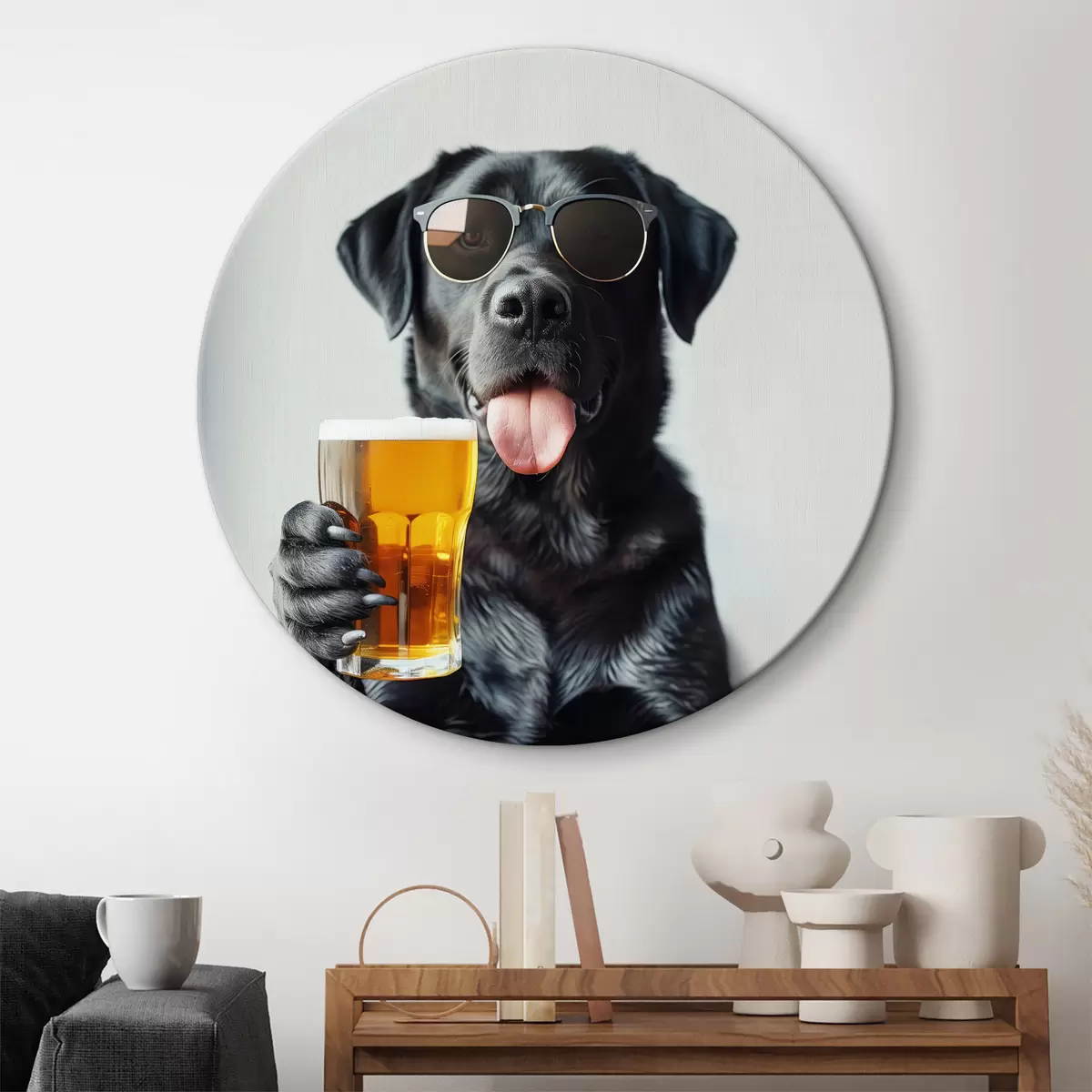 Okrągły obraz Portret czarnego labradora w okularach przeciwsłonecznych i trzymającego kufel piwa, patrzącego prosto w kamerę Nr r39470