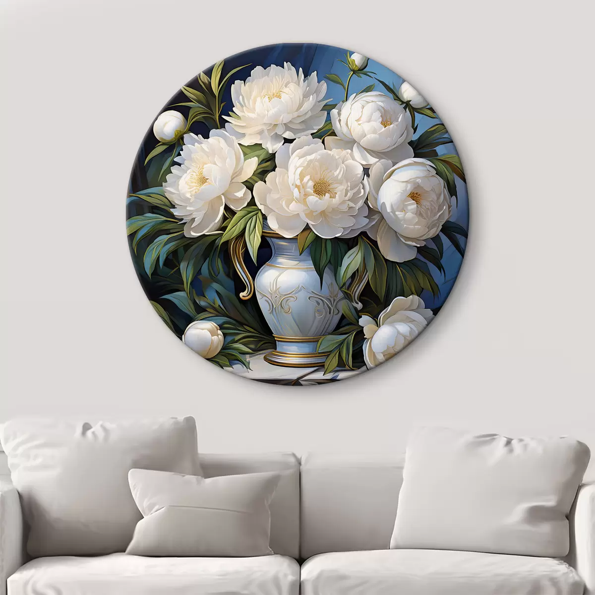 Okrągły obraz bujny bukiet białych piwonii Nr r39474