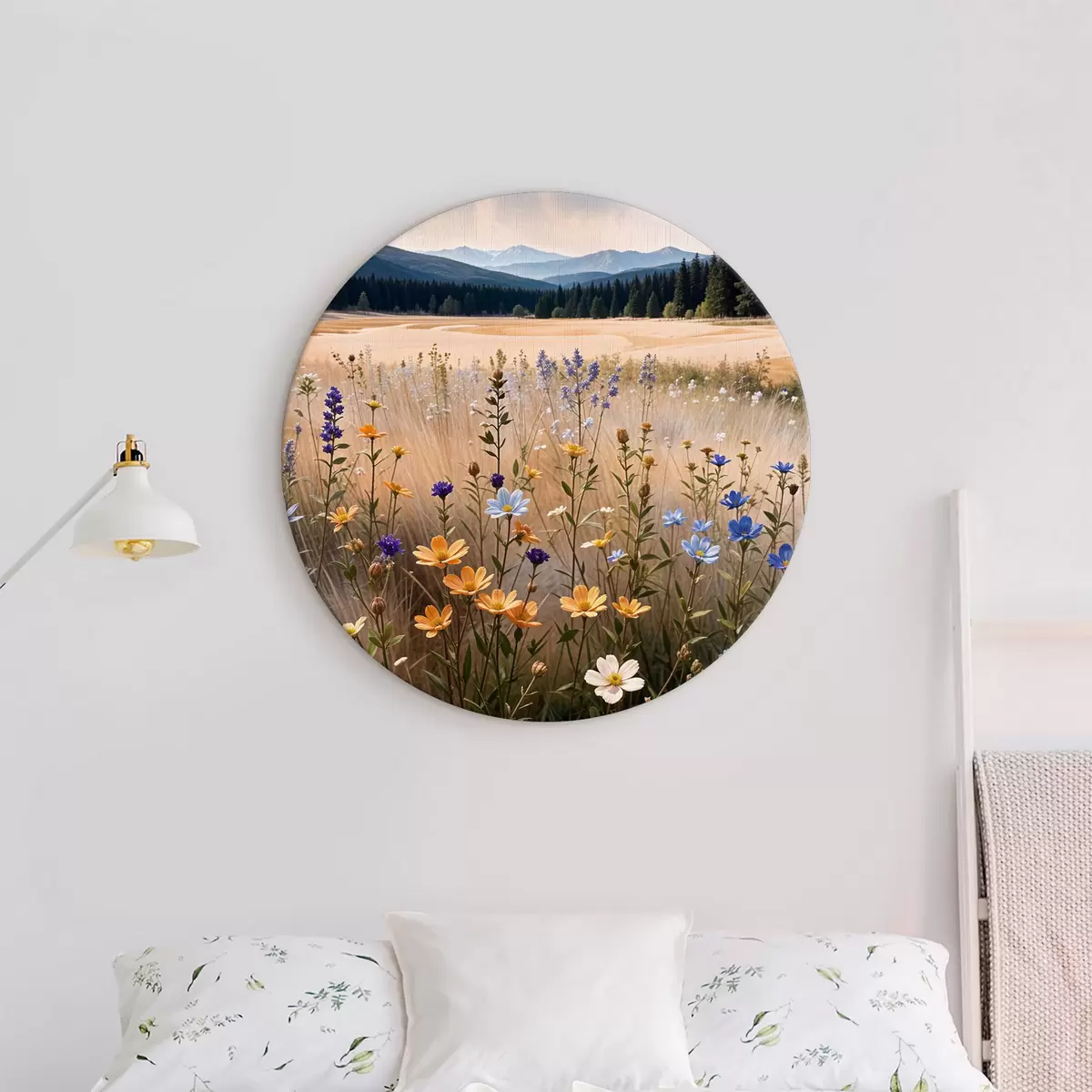 Okrągły obraz Na pierwszym planie pole kolorowych kwiatów, w tle jezioro i góry Nr r39502