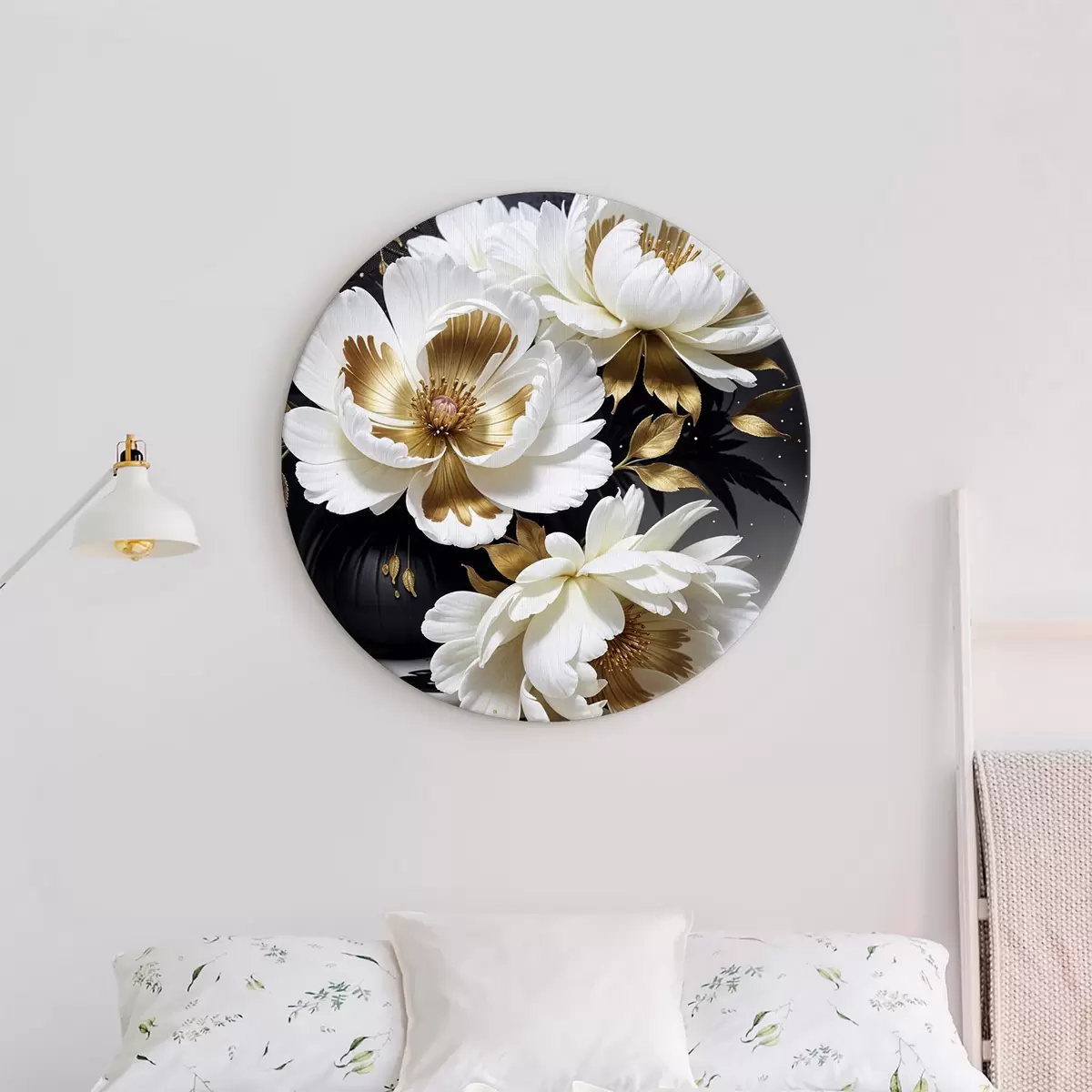 Okrągły obraz Białe kwiaty piwonii w pełnym rozkwicie, na ciemnym tle Nr r39504