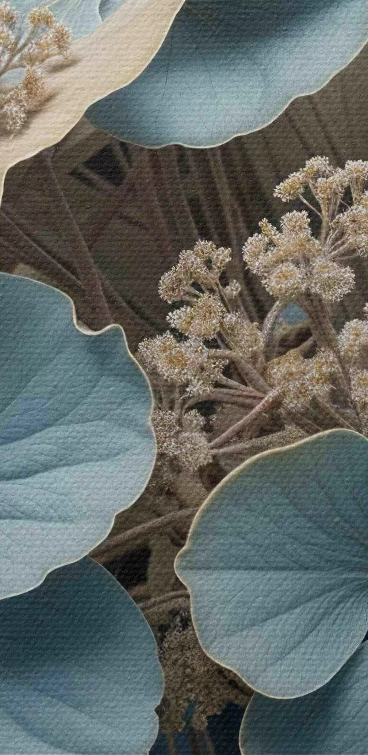 Okrągły obraz Zbliżenie niebieskich i białych kwiatów z miękkimi, rozmytymi płatkami na brązowym tle Nr r39517