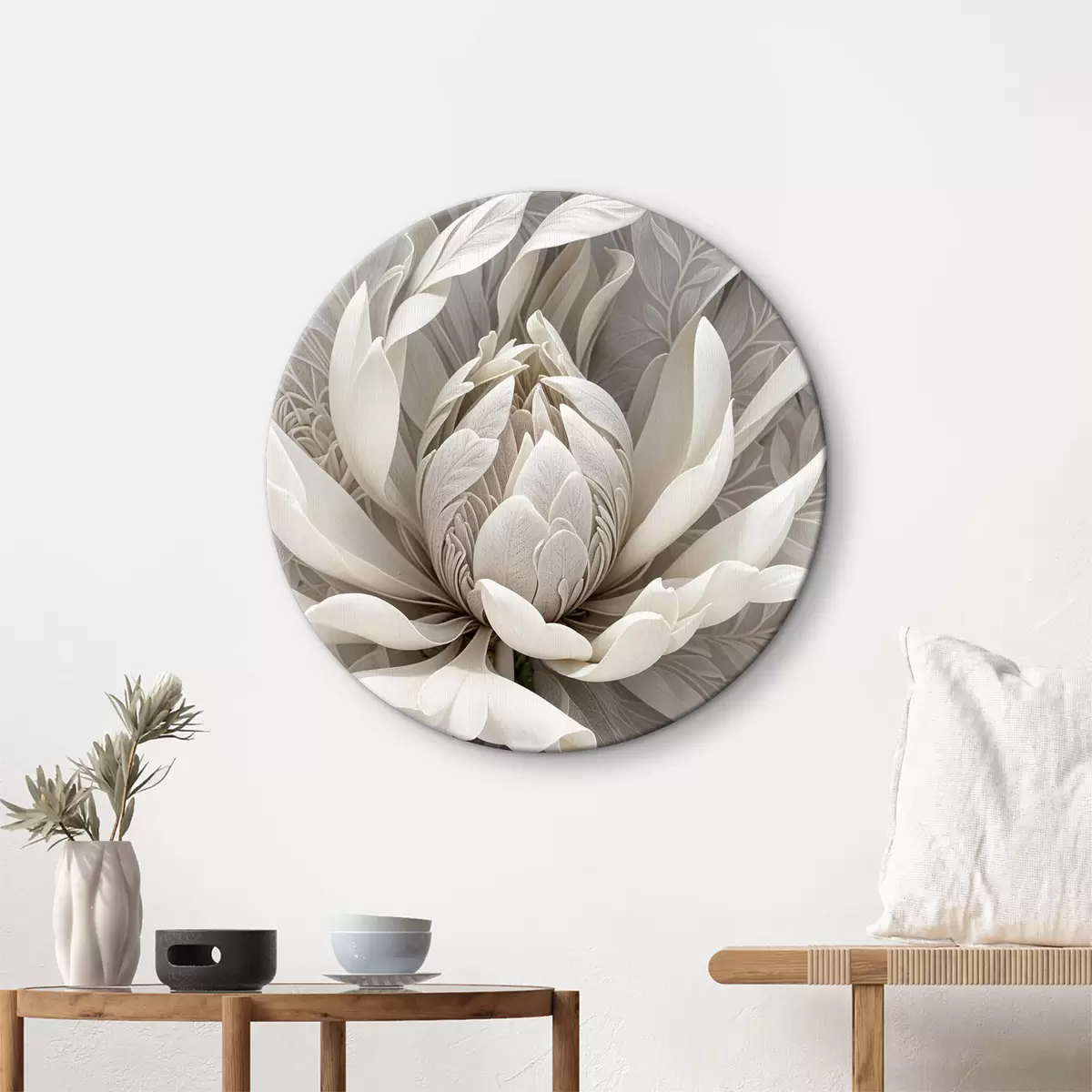 Okrągły obraz Zbliżenie dużego, jasnokremowego kwiatu dalii z delikatnymi, zachodzącymi na siebie płatkami i miękkim środkiem Nr r39520