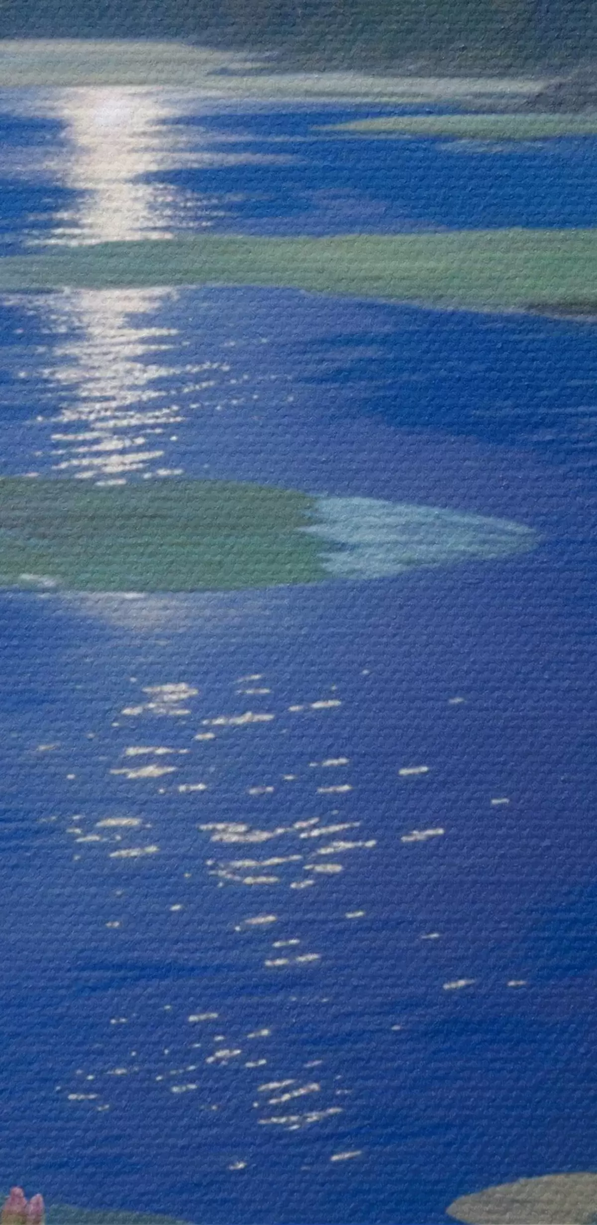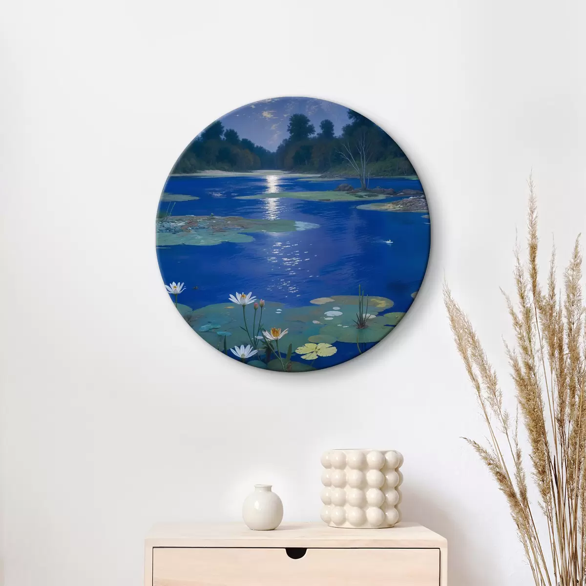 Okrągły obraz Jezioro nocą z księżycem w pełni odbijającym się w wodzie z zielonymi drzewami i liliami wodnymi Nr r39526