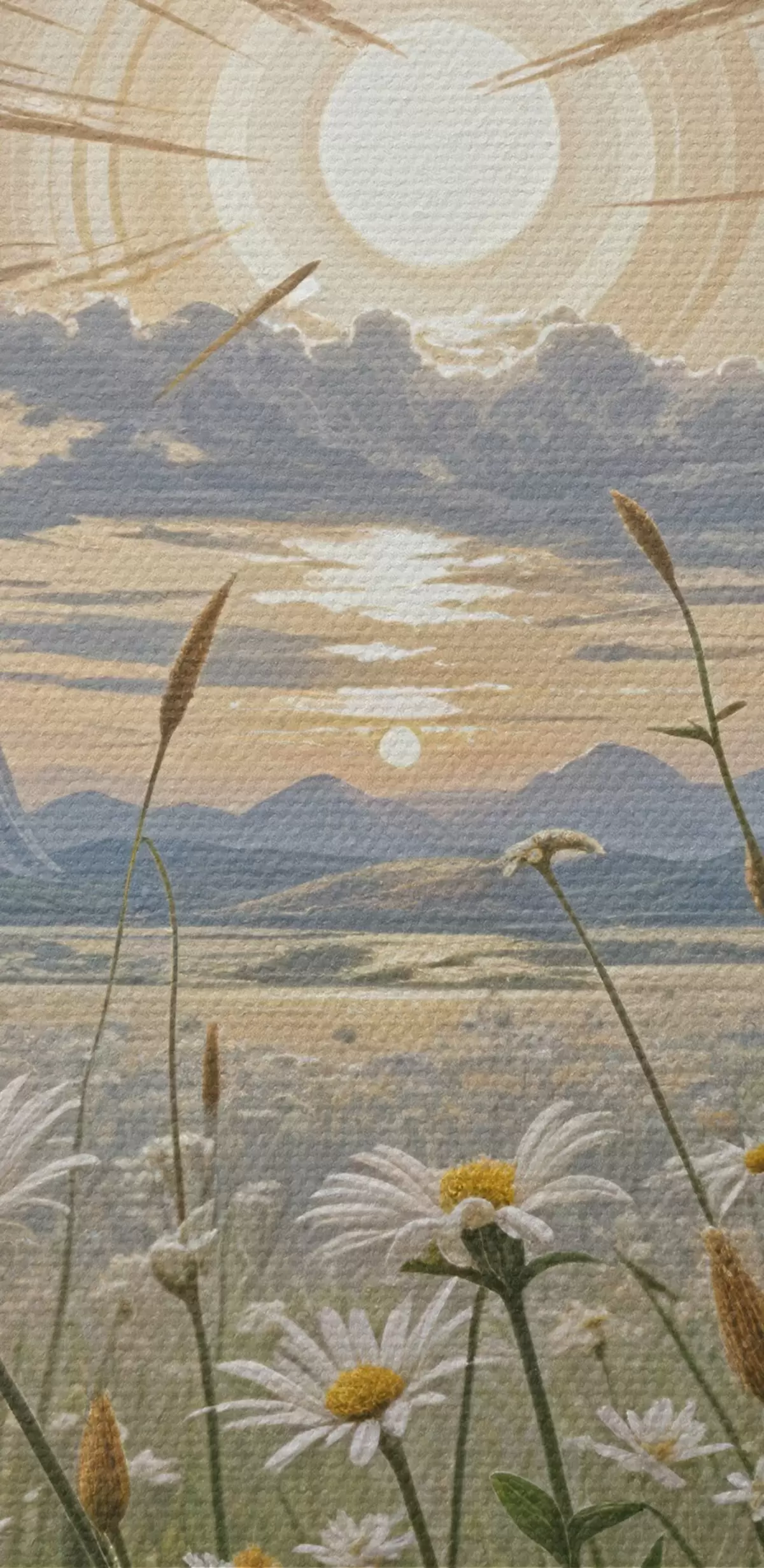 Okrągły obraz Pole białych kwiatów stokrotki na pierwszym planie z krajobrazem gór i pochmurnym niebem Nr r39528