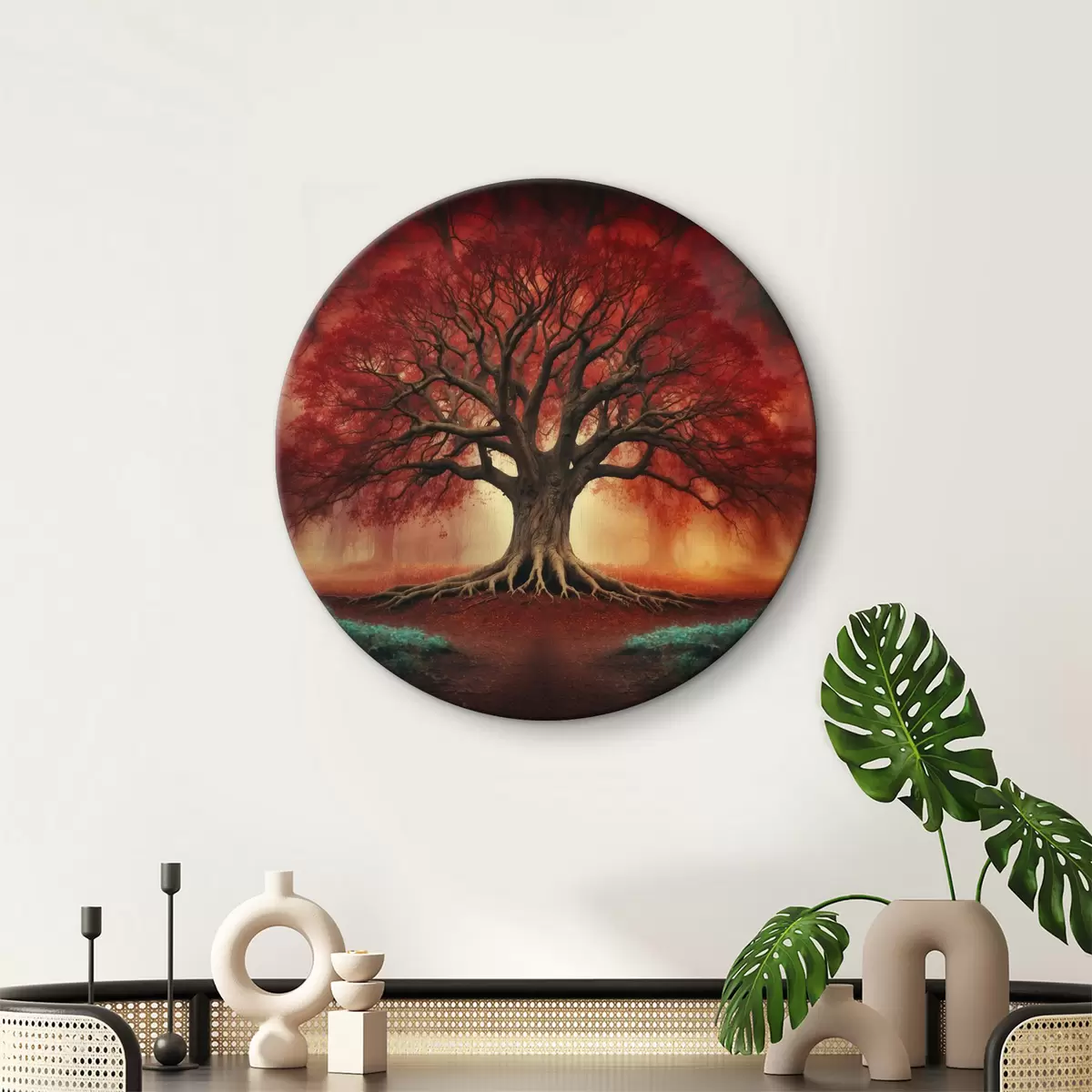Okrągły obraz Ukorzenione czerwone drzewo w lesie Nr r39602