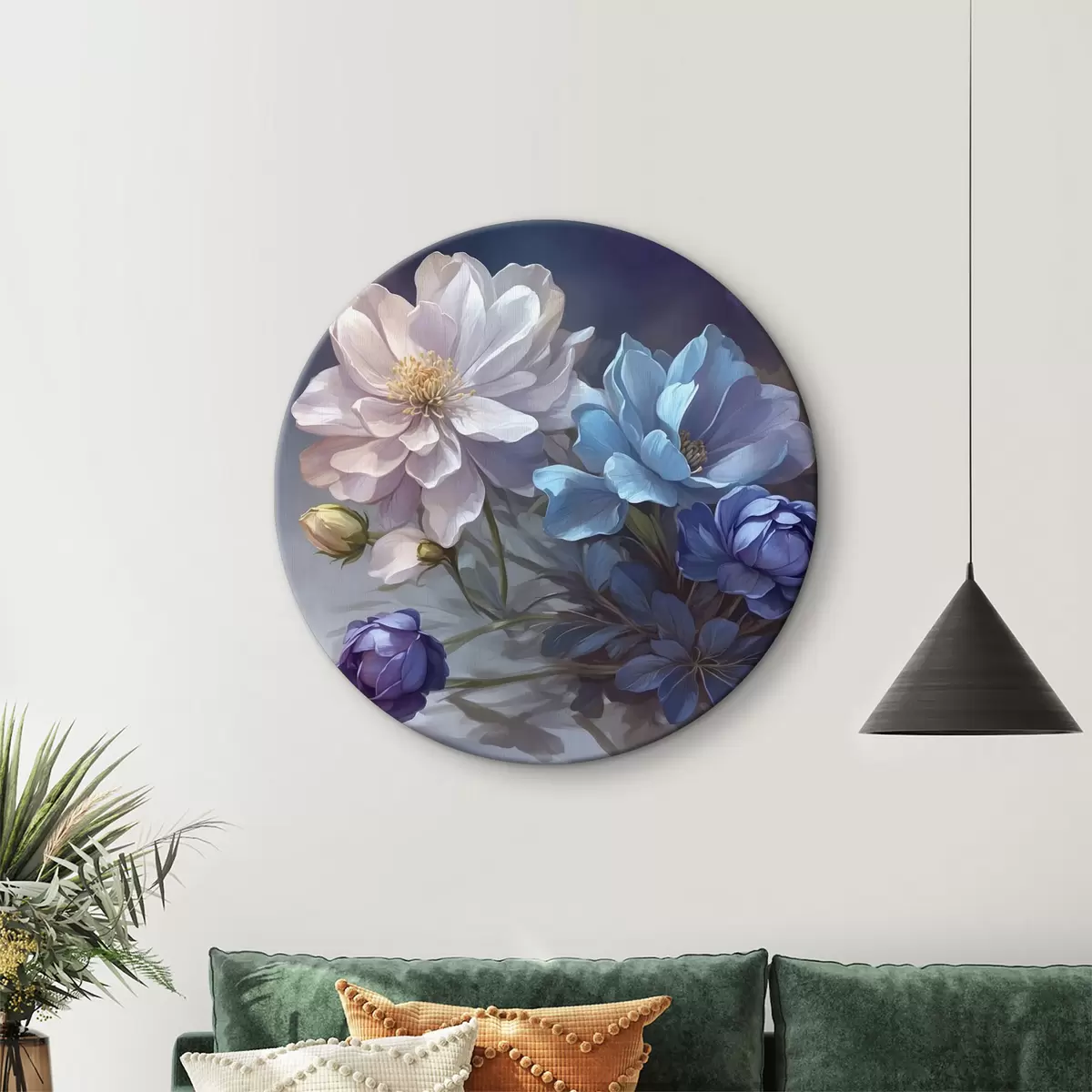 Okrągłe obrazy Białe i niebieskie kwiaty na rozmytym tle r39603