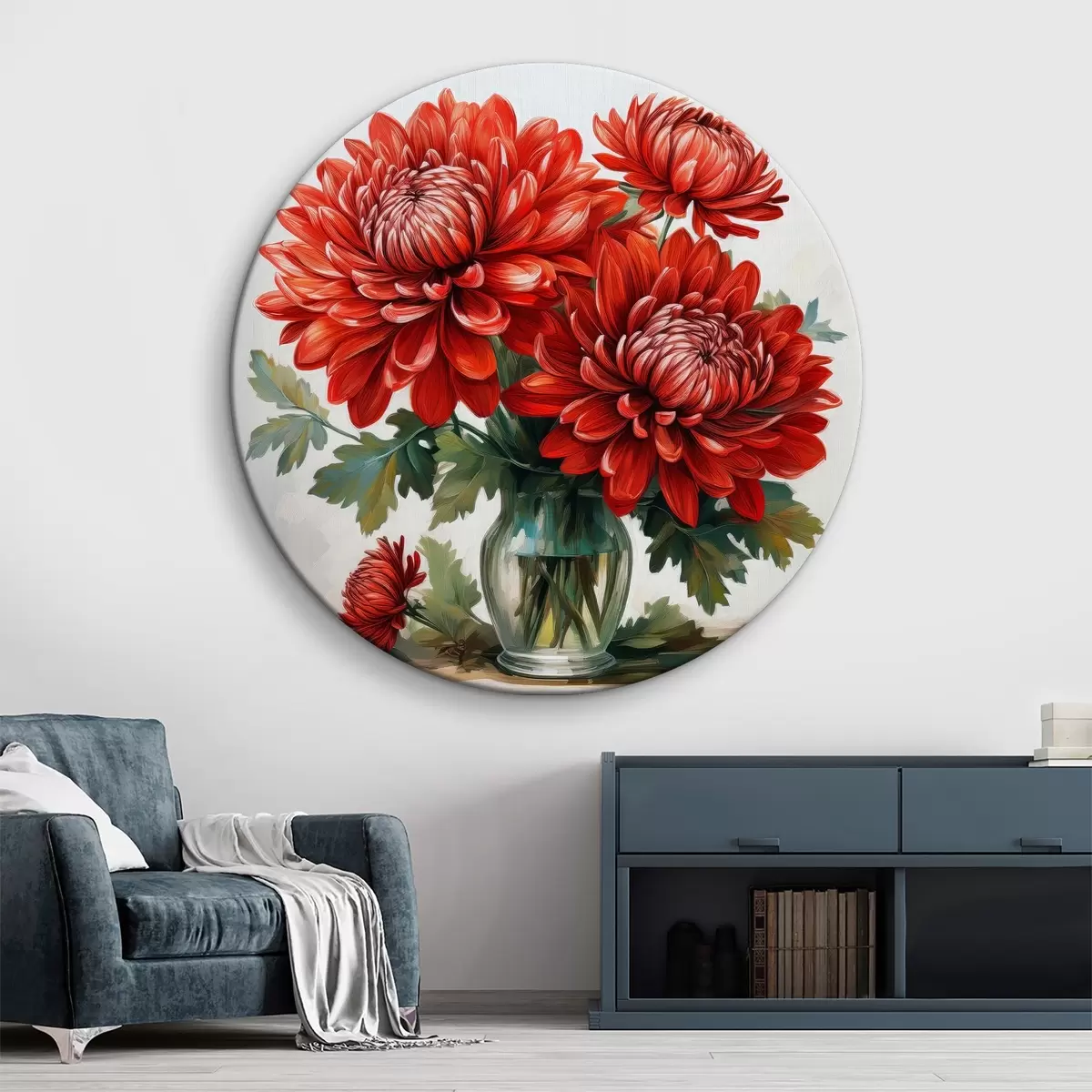 Okrągły obraz bukiet czerwonych, bujnych kwiatów Nr r39620