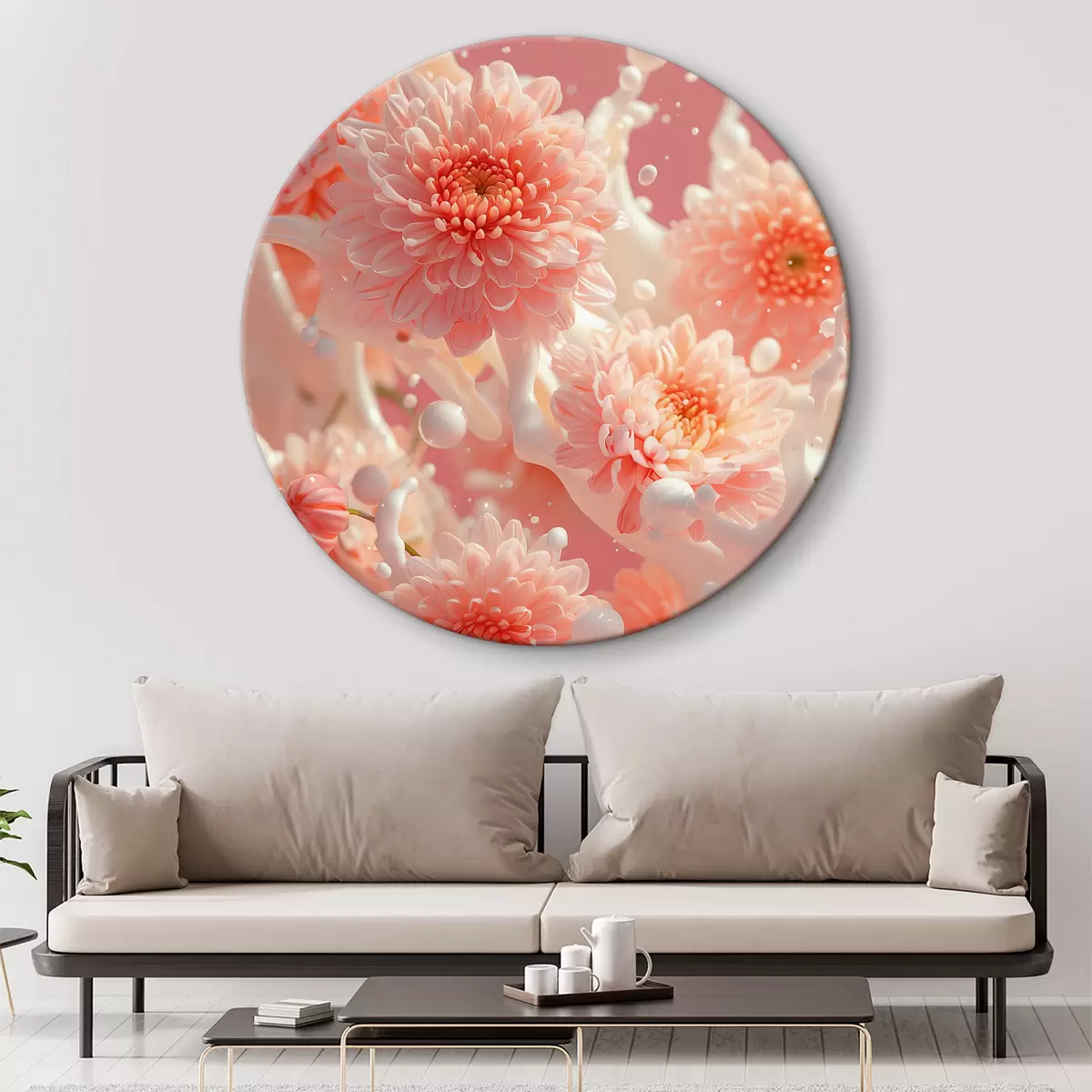 Okrągłe obrazy Różowe chryzantemy z plamami mleka na delikatnym różowym tle: kompozycja kwiatowa r39643
