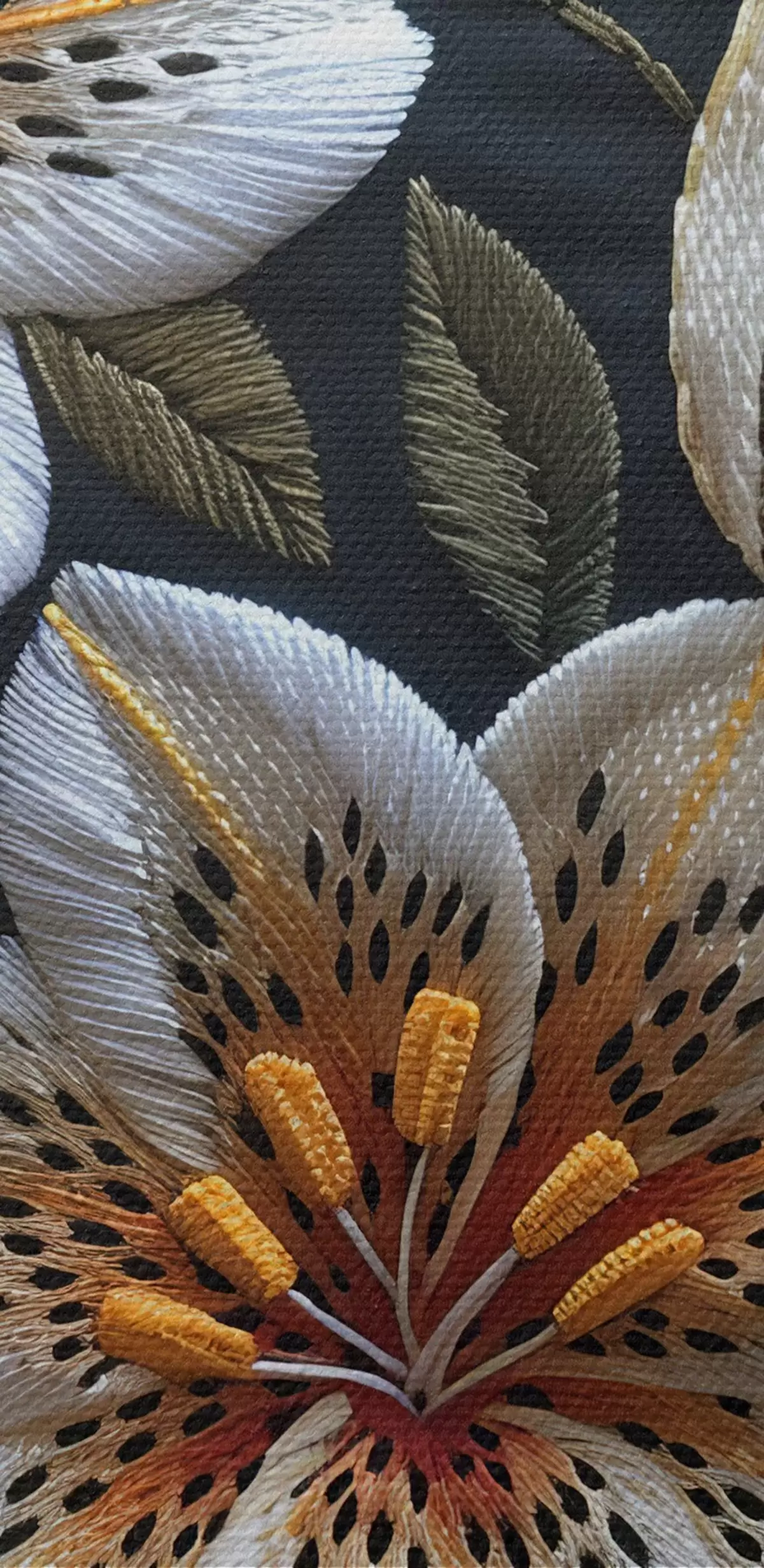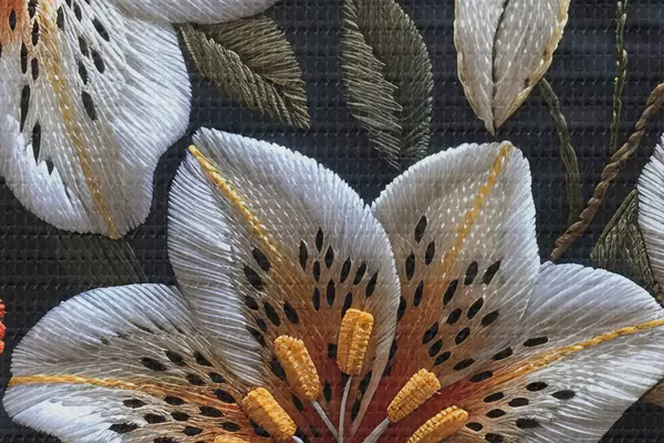 Okrągły obraz Haft typu Stumpwork: kwitnące lilie czarną nicią na ozdobnej tkaninie ze szczegółowymi dziełami sztuki Nr r39650