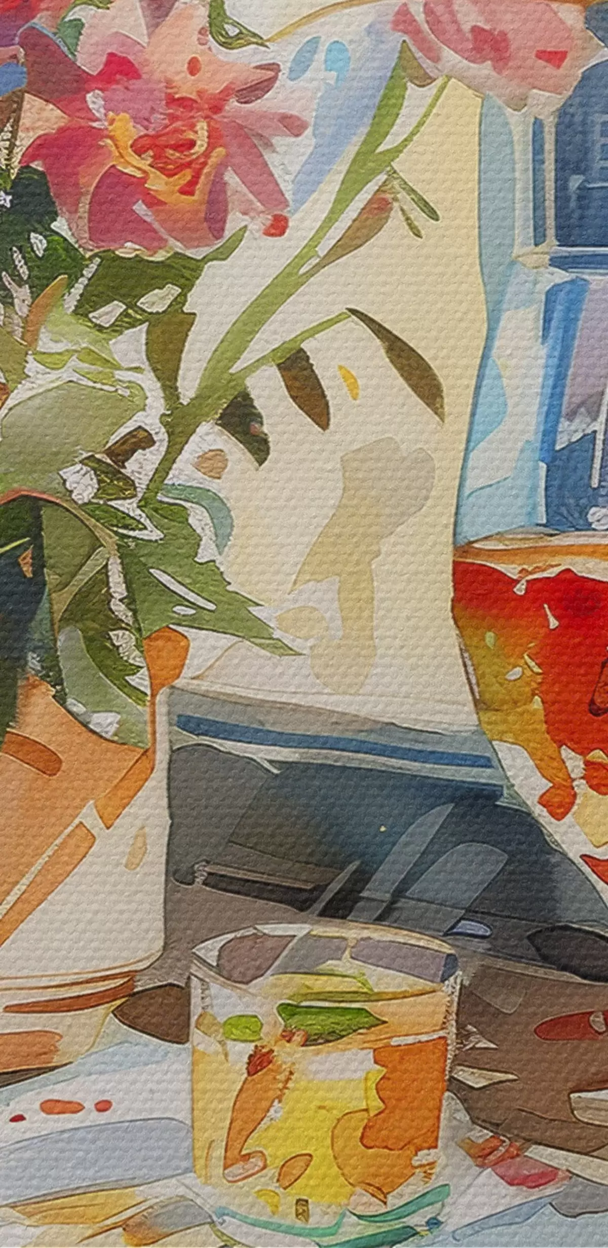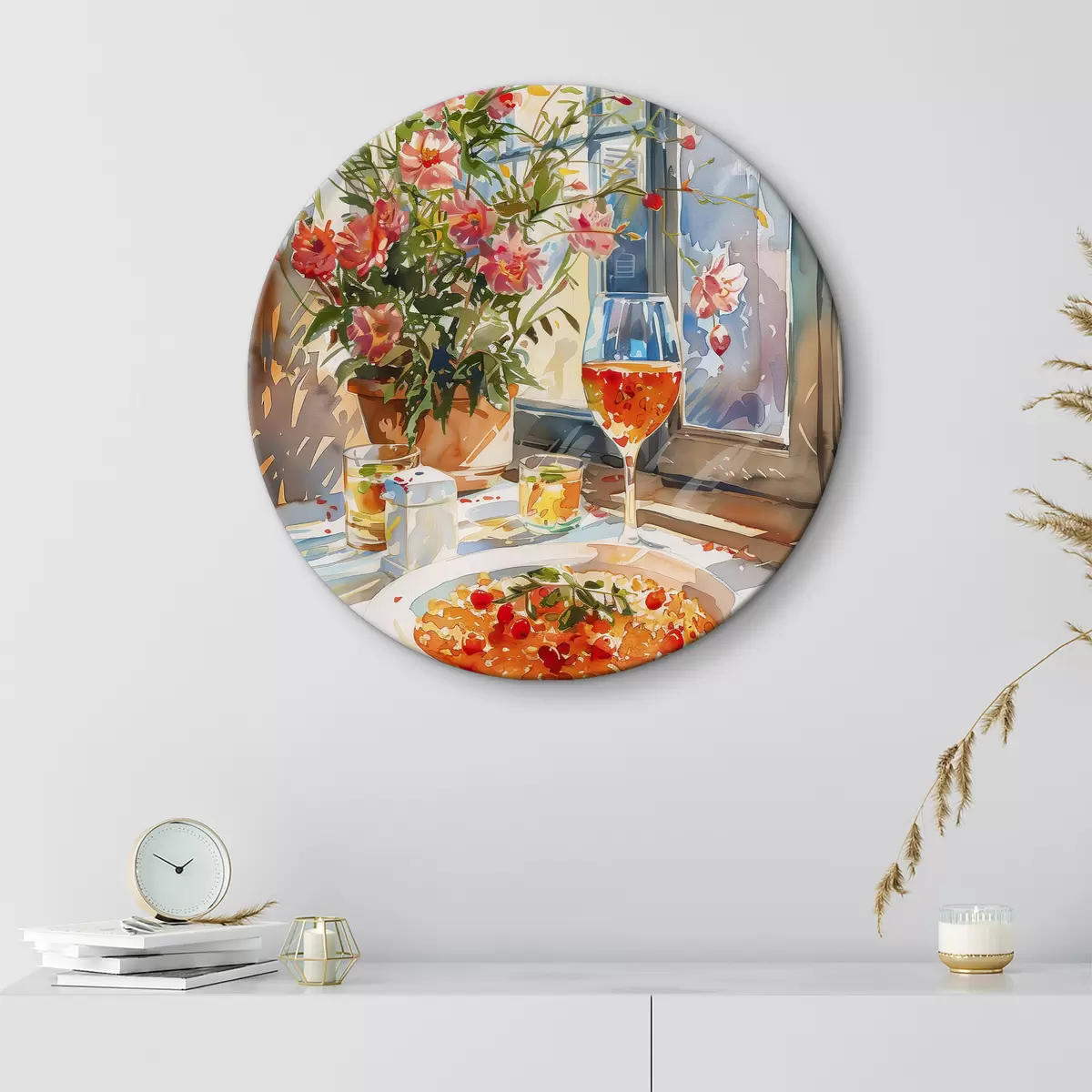Okrągły obraz Gałąź akwarelowa, światło słoneczne w oknie, kieliszek koktajlu, letnie kwiaty Nr r39707
