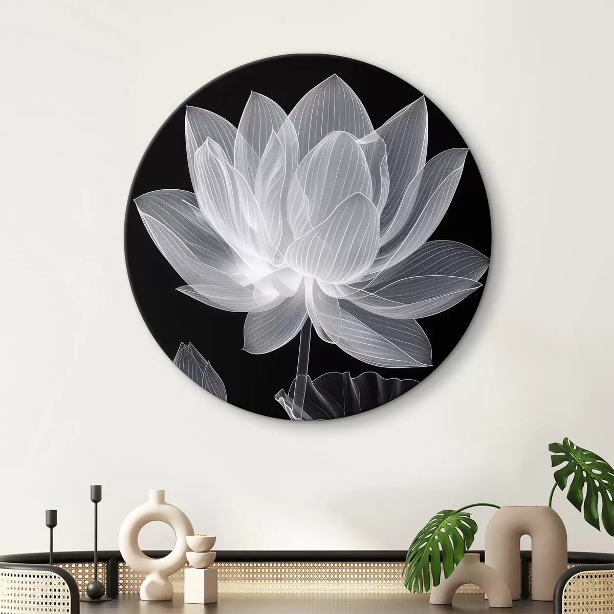Okrągły obraz Delikatny półprzezroczysty lotos na ciemnym tle Nr r39717